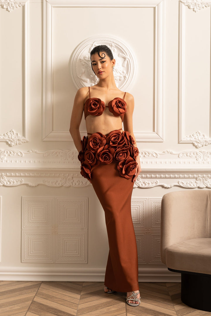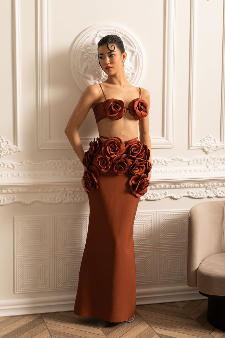 Bu büyüleyici kahverengi saten ikili takım, zarif saten dokusu ve detaylı 3D çiçek işlemeleriyle göz alıcı bir şıklık sunar. Çiçek motifleriyle süslenmiş büstiyeri ve maxi etek kesimi sayesinde asil bir silüet yaratır. İkili takımın her iki parçası da arka fermuarlarla kolayca giyilebilir. Özel davetlerde ve şık organizasyonlarda dikkatleri üzerine çekmek isteyenler için mükemmel bir tercih!