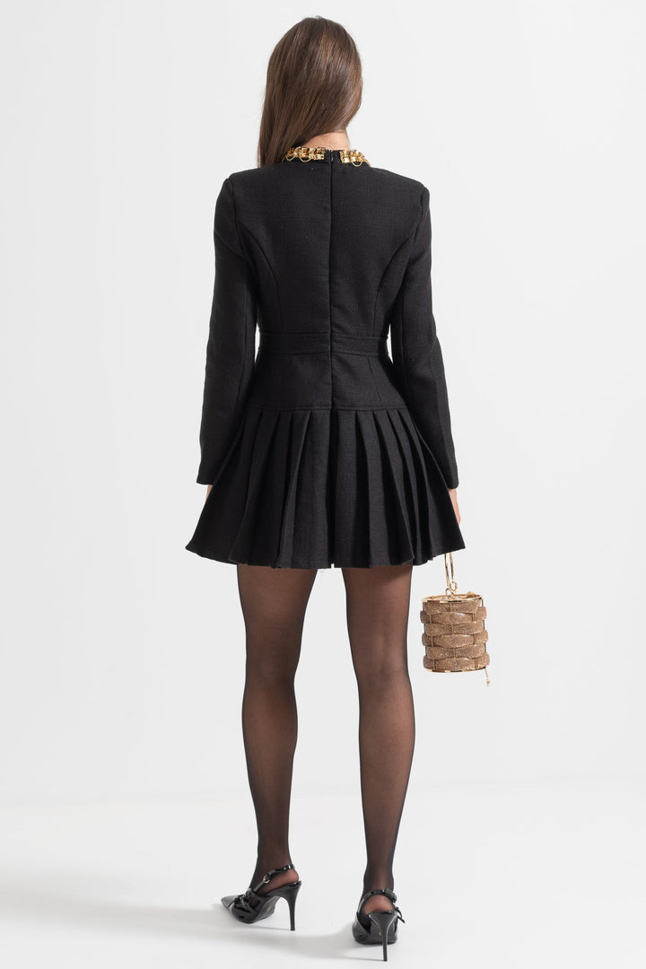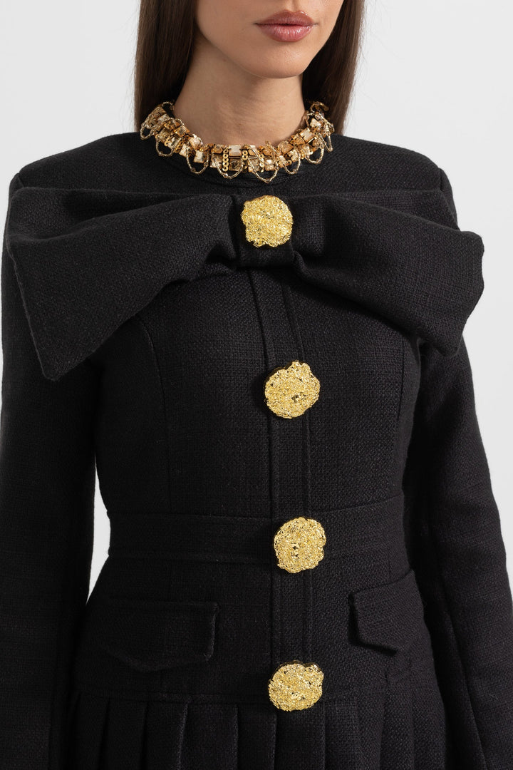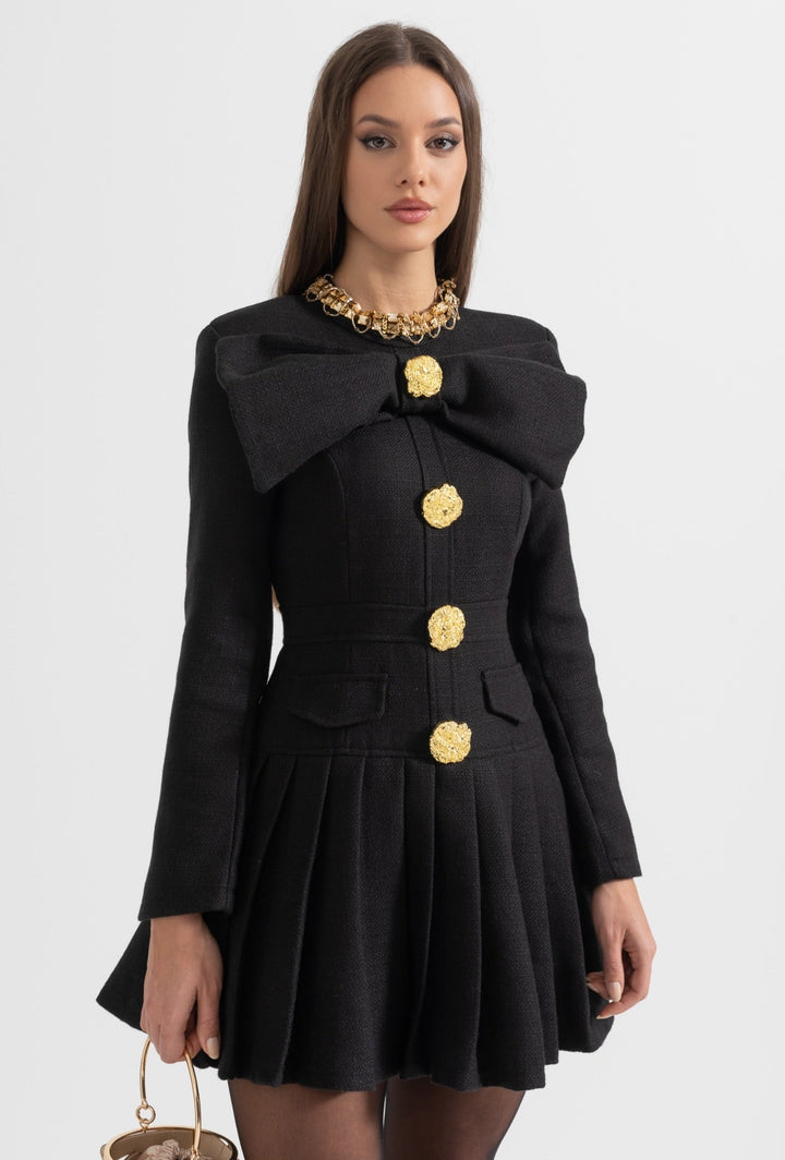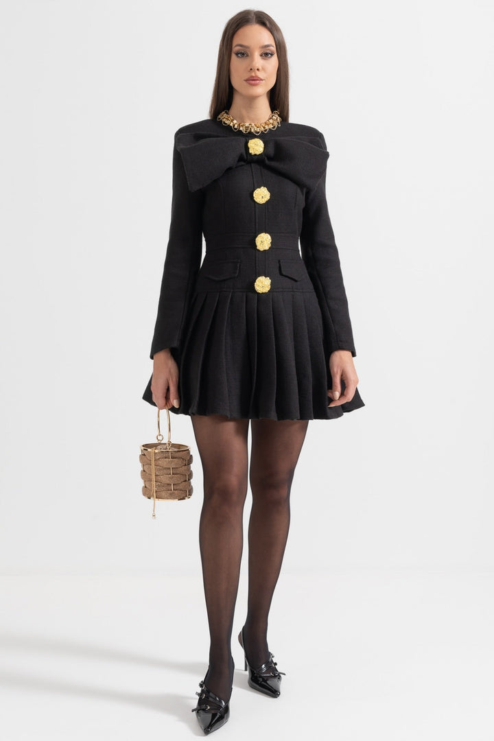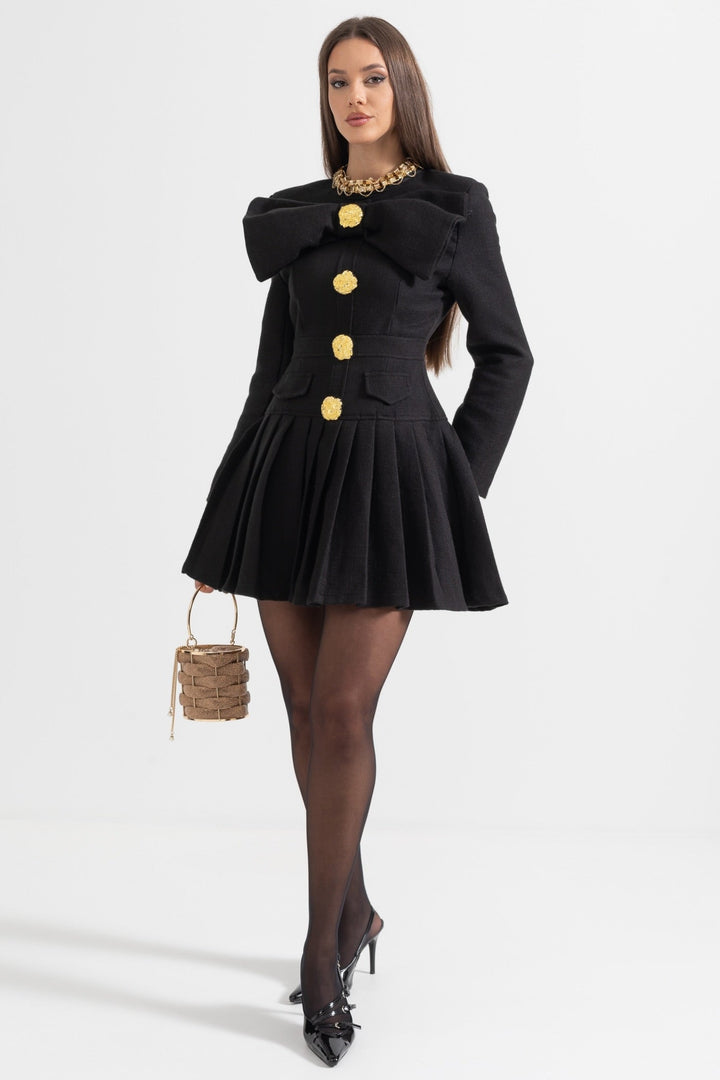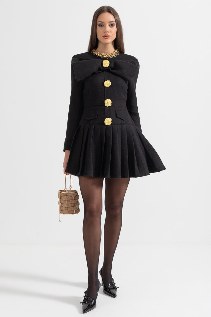 Zarif detaylarıyla öne çıkan bu siyah elbise, sofistike şıklığı modern dokunuşlarla buluşturuyor. Önde yer alan büyük dekoratif altın düğmeler ve dikkat çekici yaka fiyonk detayı tasarıma feminen bir hava katarken, pileli etek formu zarif bir hareketlilik sağlar. Uzun kollu ve vücuda oturan siluet kesimiyle özel davetlerden iş şıklığına kadar pek çok ortamda stilinizi tamamlar.