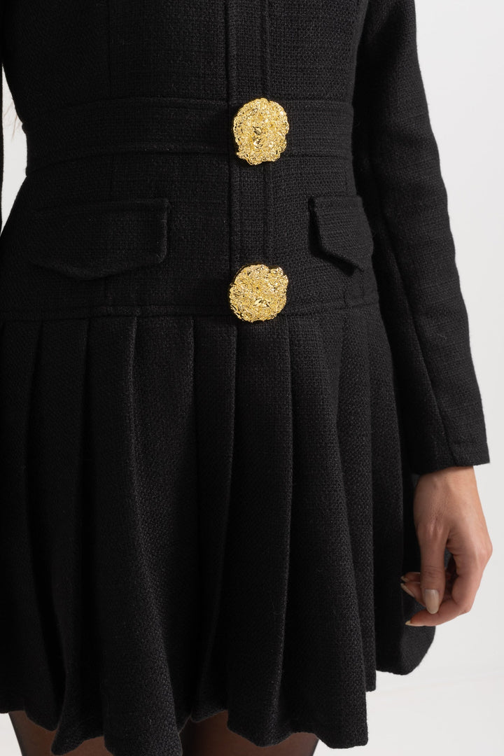 Siyah Yaka Fiyonklu ve Altın Düğmeli Elbise