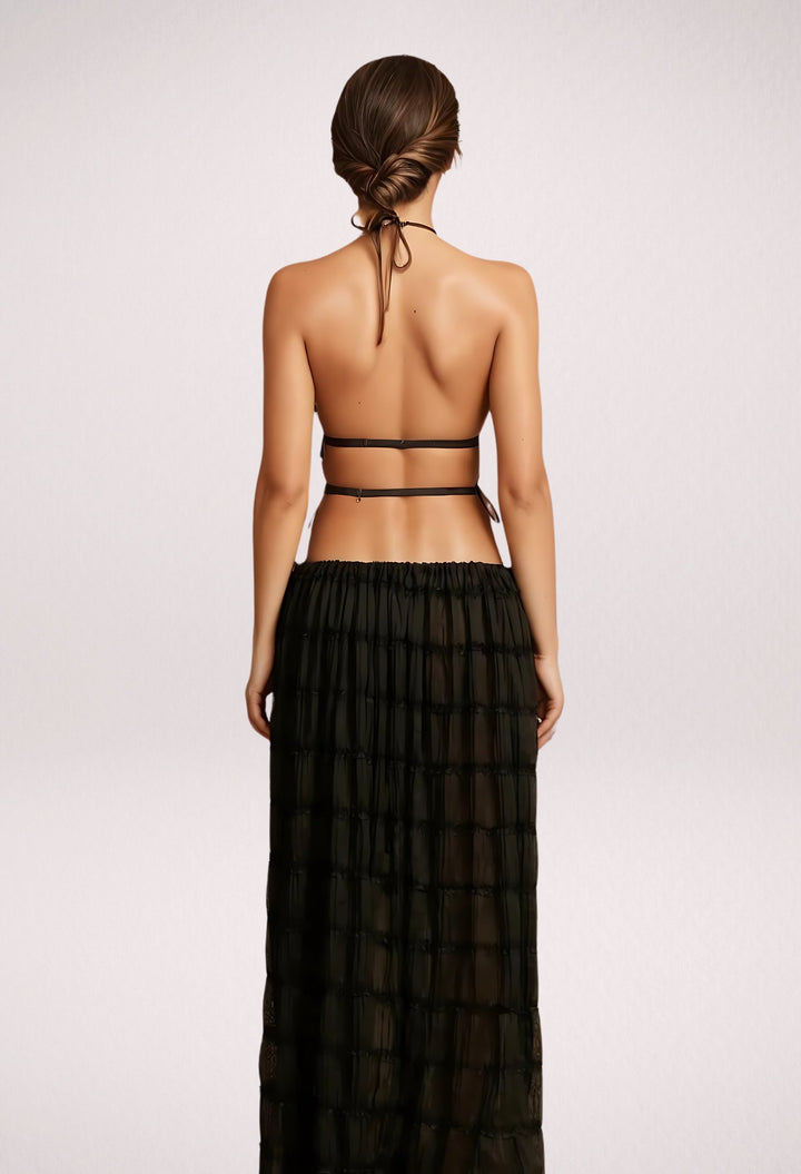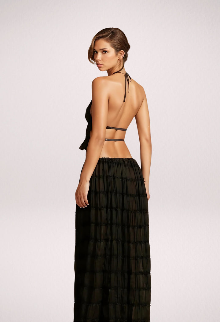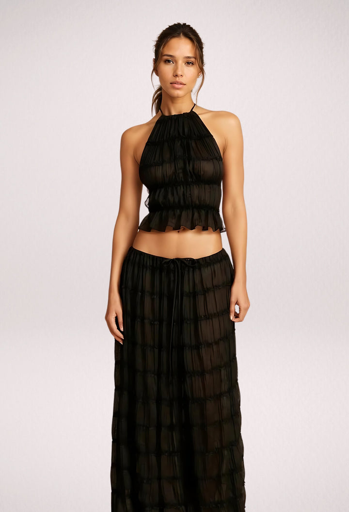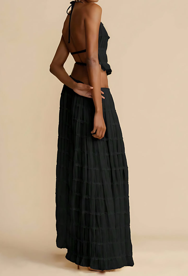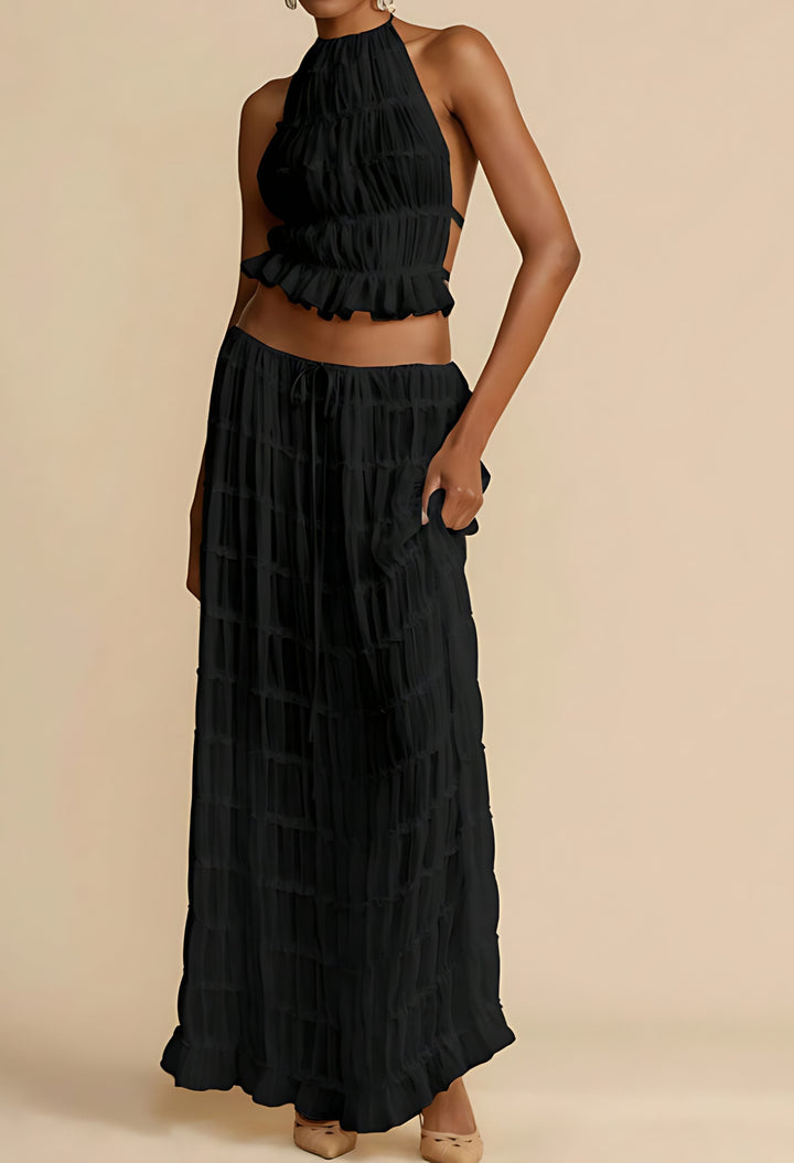 Bu zarif takım, hassas fırfır detaylarına sahip yüksek yakalı bir üst kısma sahiptir ve kişiselleştirilmiş bir uyum için ayarlanabilir bağları olan sırtı açık bir tasarıma sorunsuz bir şekilde geçiş yapar. Elbiseye eşlik eden maksi etek, her adımınıza hareket ve zarafet katan ince pililerle zahmetsizce akar. Lüks polyesterden üretilen Amina Elbise, hem rahatlık hem de sofistike bir görünüm sunarak kalıcı bir etki bırakmak istediğiniz her durum için mükemmel bir seçimdir.