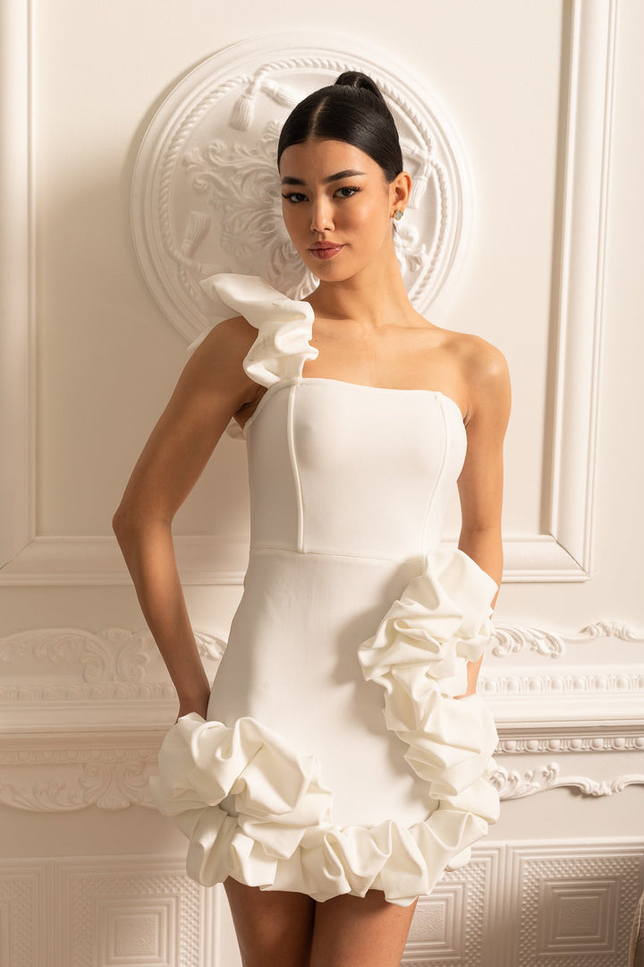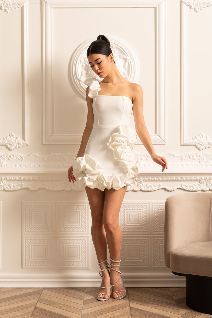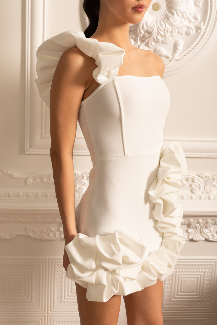 Beyaz Çiçek Desenli Mini Elbise – Fırfırlı Etek Ucu ve Omuz Askısıyla