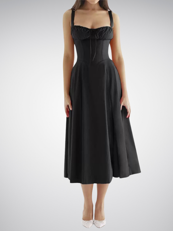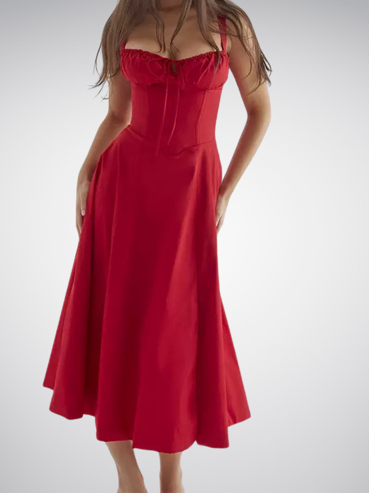 Ön bağcık detayı ve fırfırlı süslemeleriyle dikkat çeken bu şık parti elbisesi, kare yaka ve yırtmaçlı diz tasarımıyla zarafeti ön plana çıkarıyor. Midi uzunluğu ve vücuda uyumlu kesimiyle çeşitli özel etkinlikler için ideal bir seçim sunar.
