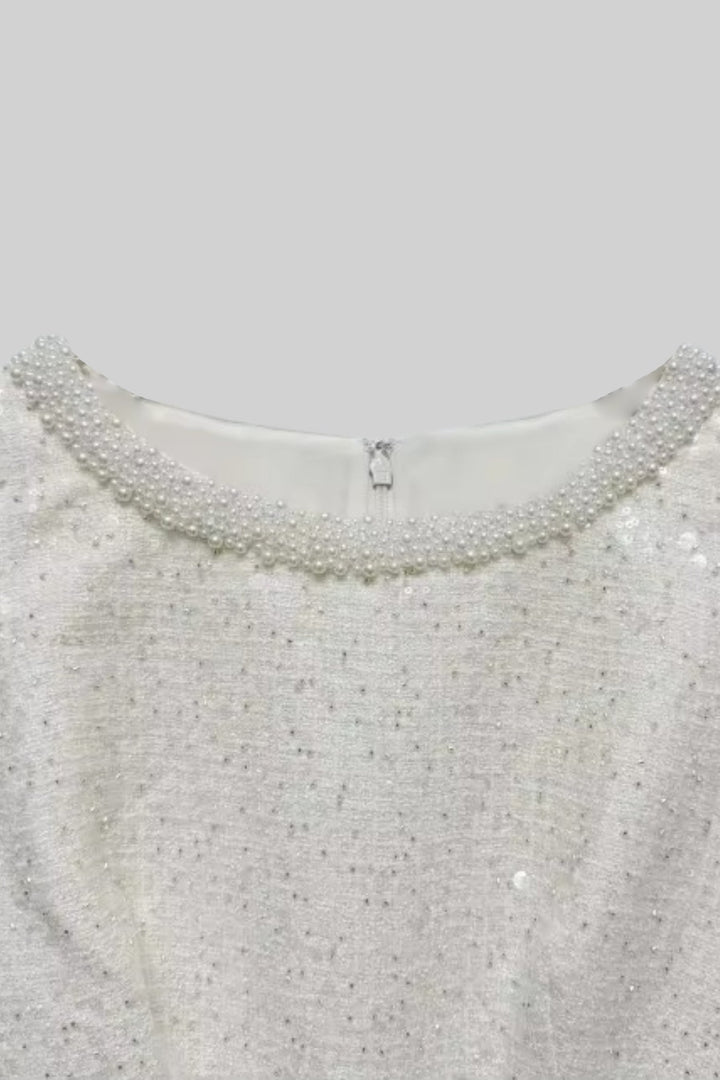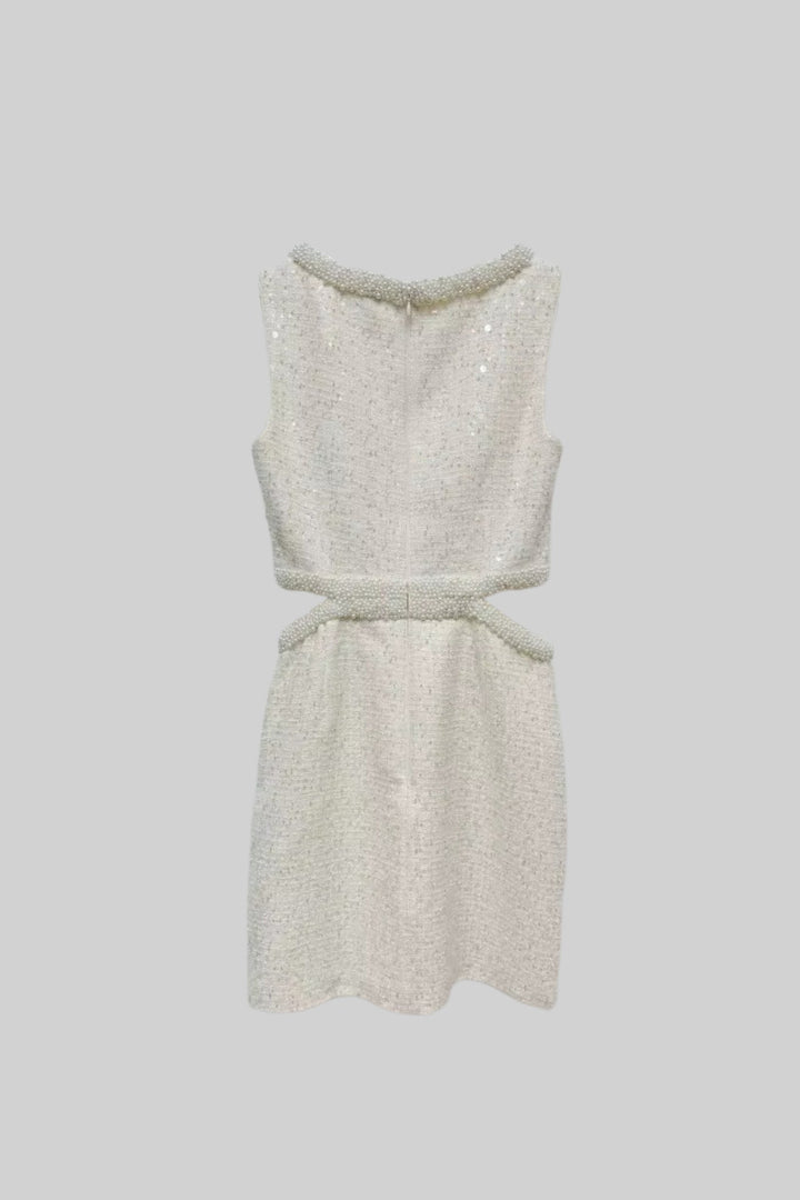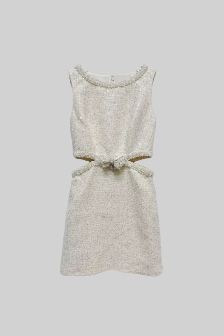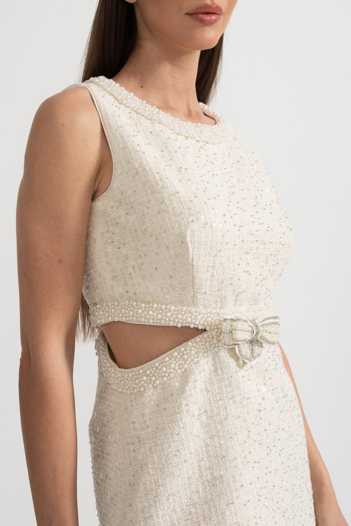 İvory Simli Kolsuz Mini Elbise, Bel Kesimi ve Fiyonk Detayı ile