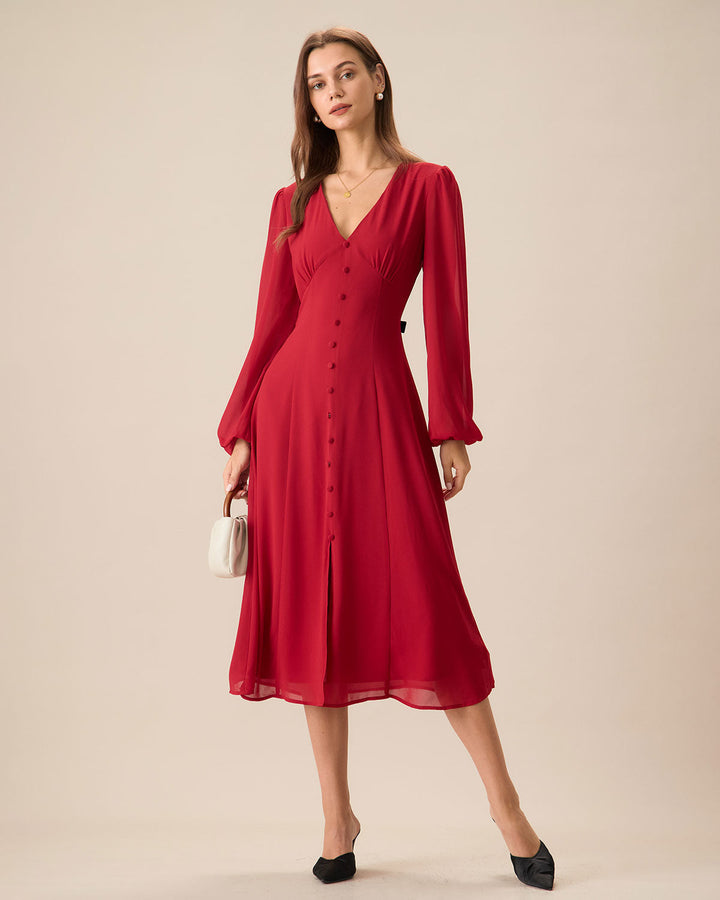 Hafif ve nefes alabilir kumaşıyla tasarlanan bu zarif midi elbise, V yaka detayı ve modern puff kollara sahip, vintage bir dokunuş sunar.