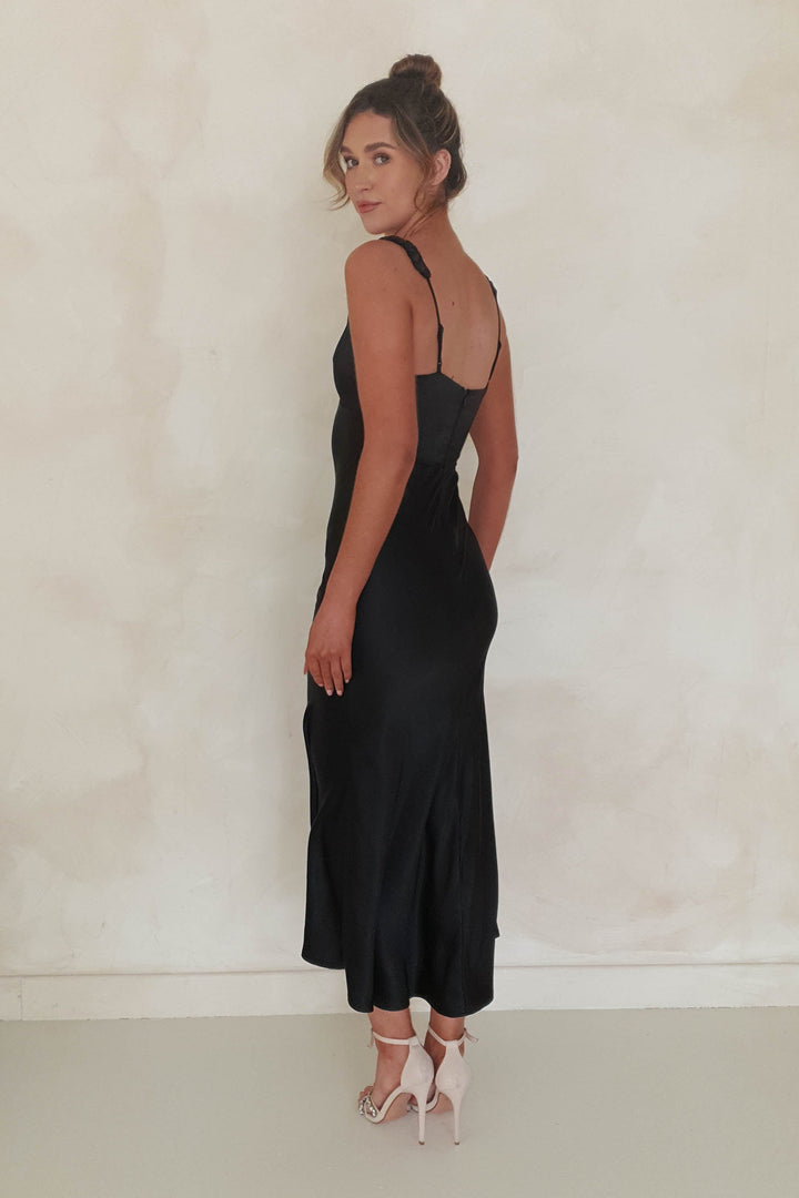 Bethanie Yumuşak Saten Maksi Elbise | Siyah