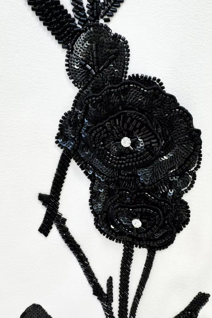 Şıklığı ve zarafeti bir arada sunan bu beyaz mini elbise, kontrast çiçek nakışlarıyla modern ve feminen bir görünüm kazanıyor. Uzun kollu tasarımı, sade yuvarlak yaka kesimi ve vücuda oturan siluetiyle hem günlük şıklığa hem de özel davetlere uyum sağlar. Arkadaki gizli fermuarı ile pratik kullanım sunarken, nefes alabilir kumaşı konforlu bir giyim deneyimi sağlar.