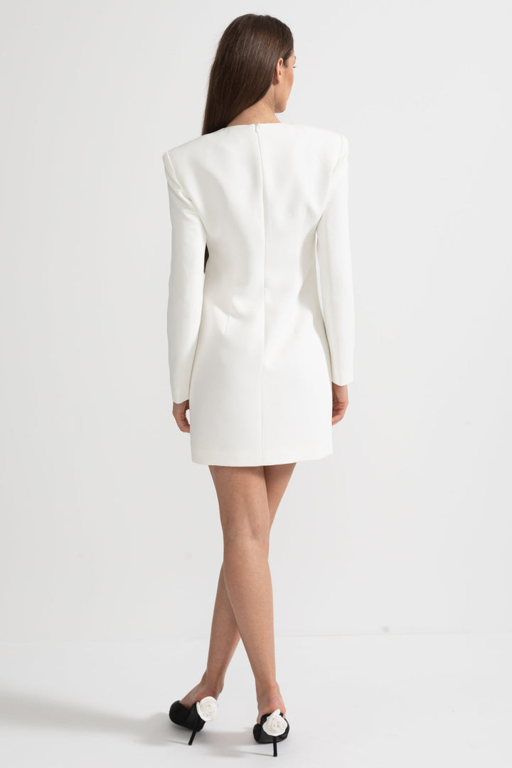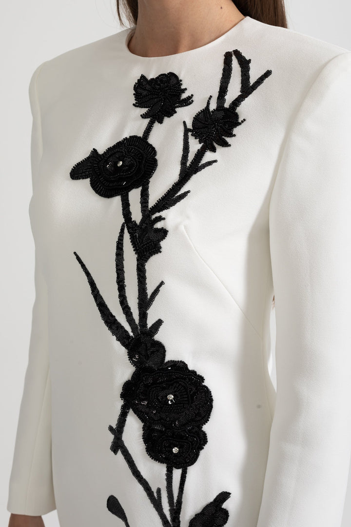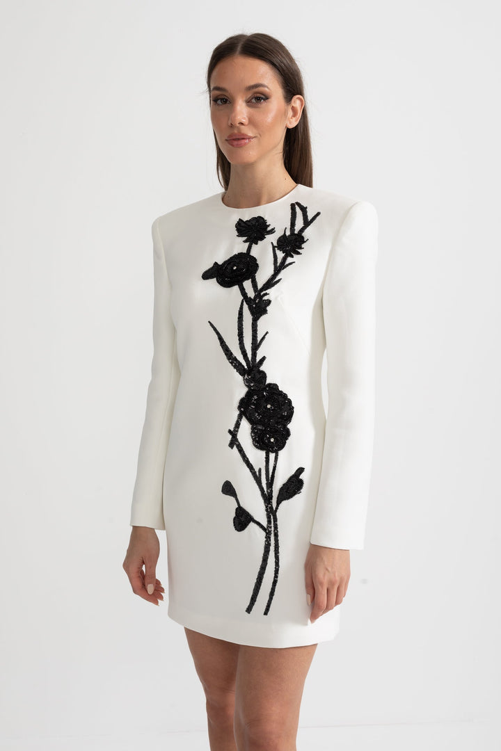 Beyaz Uzun Kollu Mini Elbise – Kontrast Çiçek Nakışlı