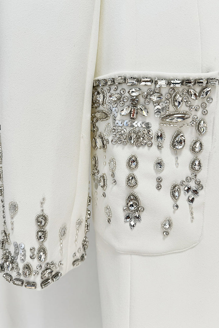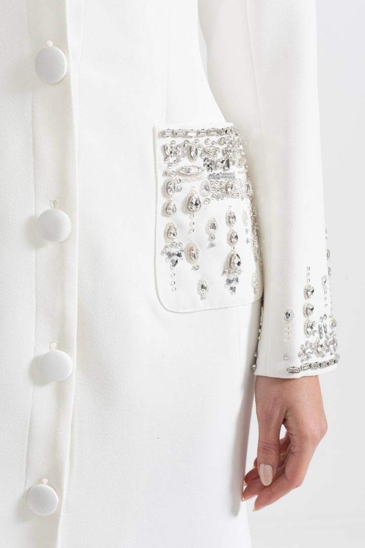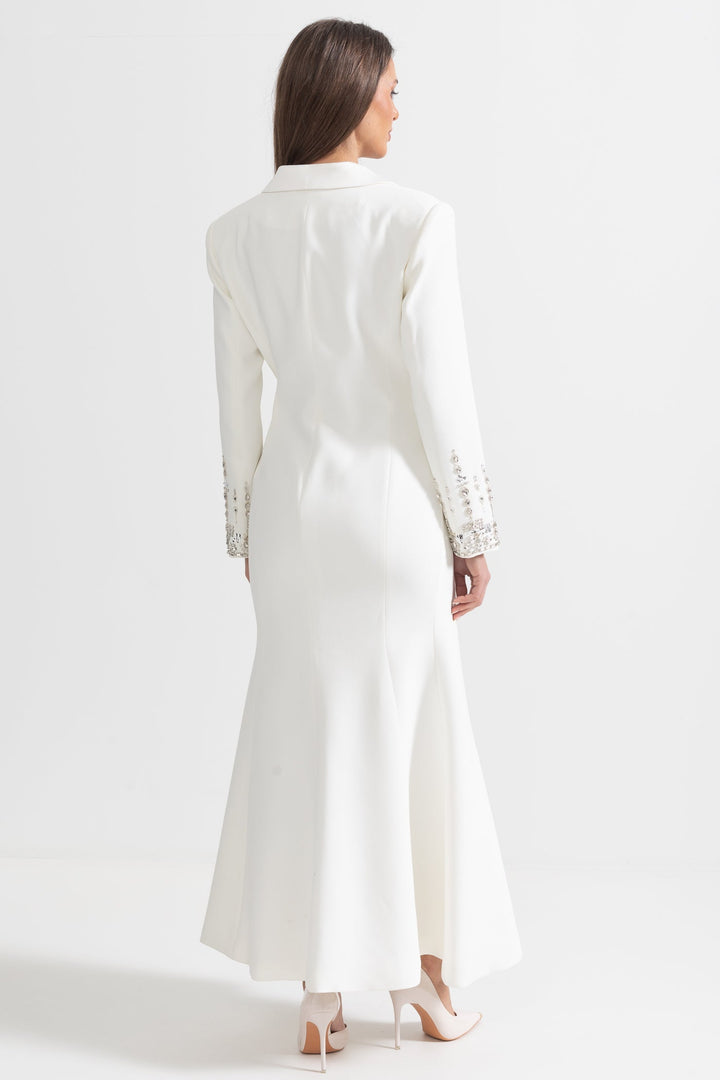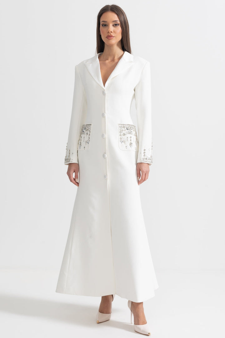 Zamansız şıklığıyla öne çıkan bu beyaz elbise, kristal işlemeleri ve zarif kesimiyle göz alıcı bir stil sunuyor. Yaka detaylı tasarımı, uzun silueti ve tam boy kollarıyla sofistike bir görünüm sağlarken, öndeki dört düğmeli kapama feminen bir zarafet katar. Özel günlerde ve davetlerde şıklığınızı tamamlayacak kusursuz bir seçim.
