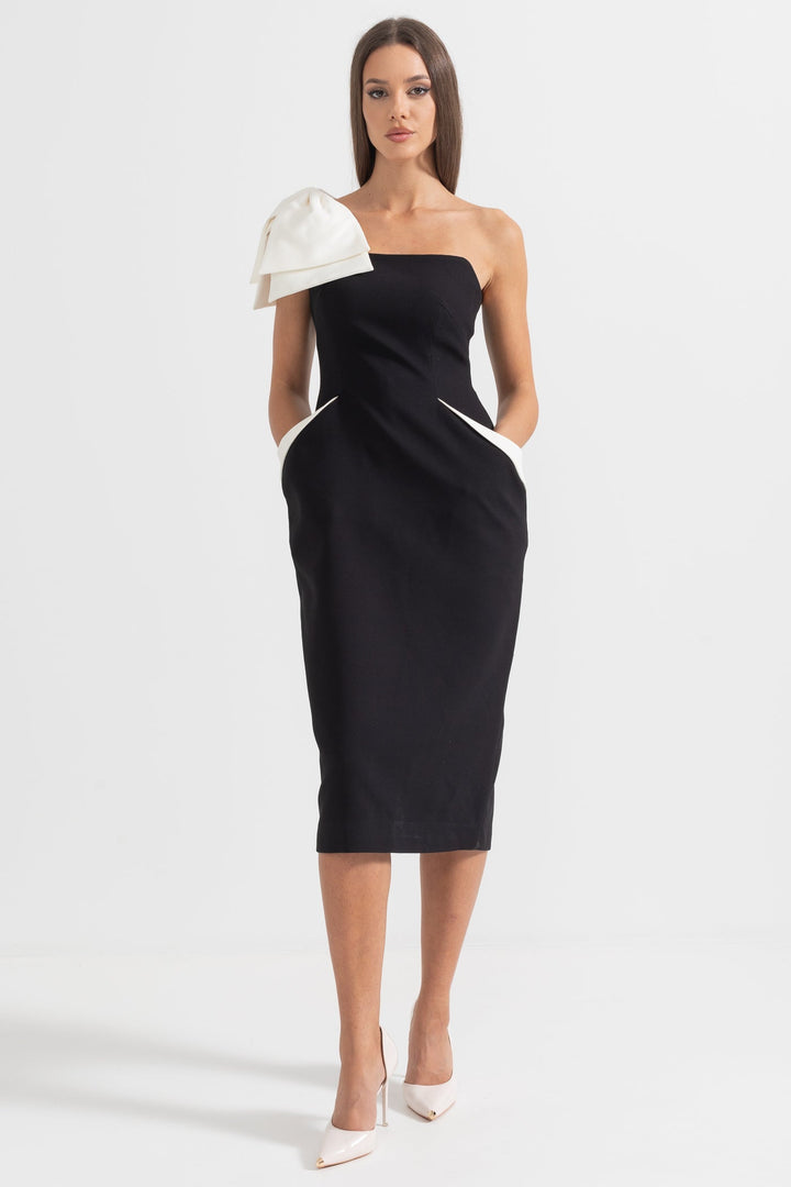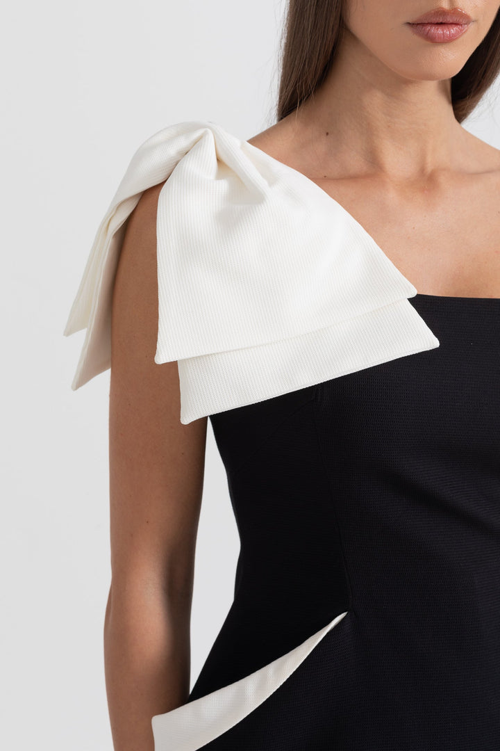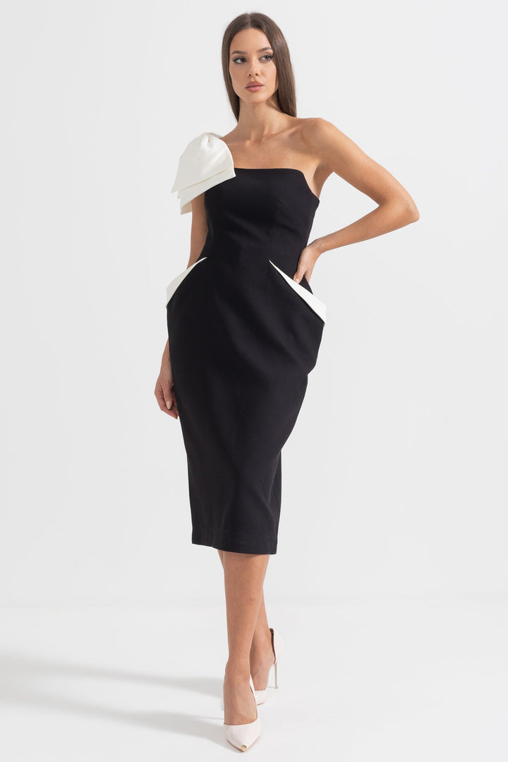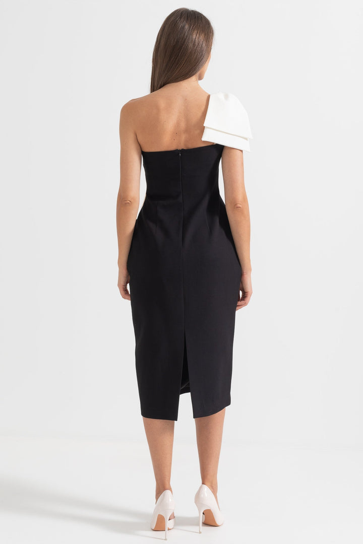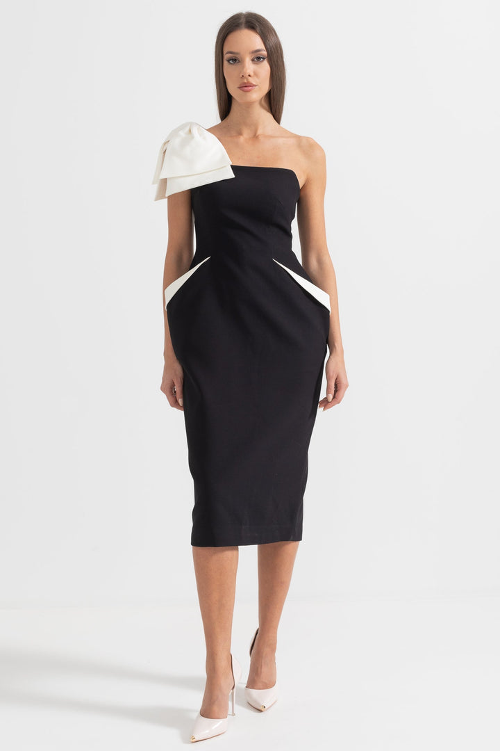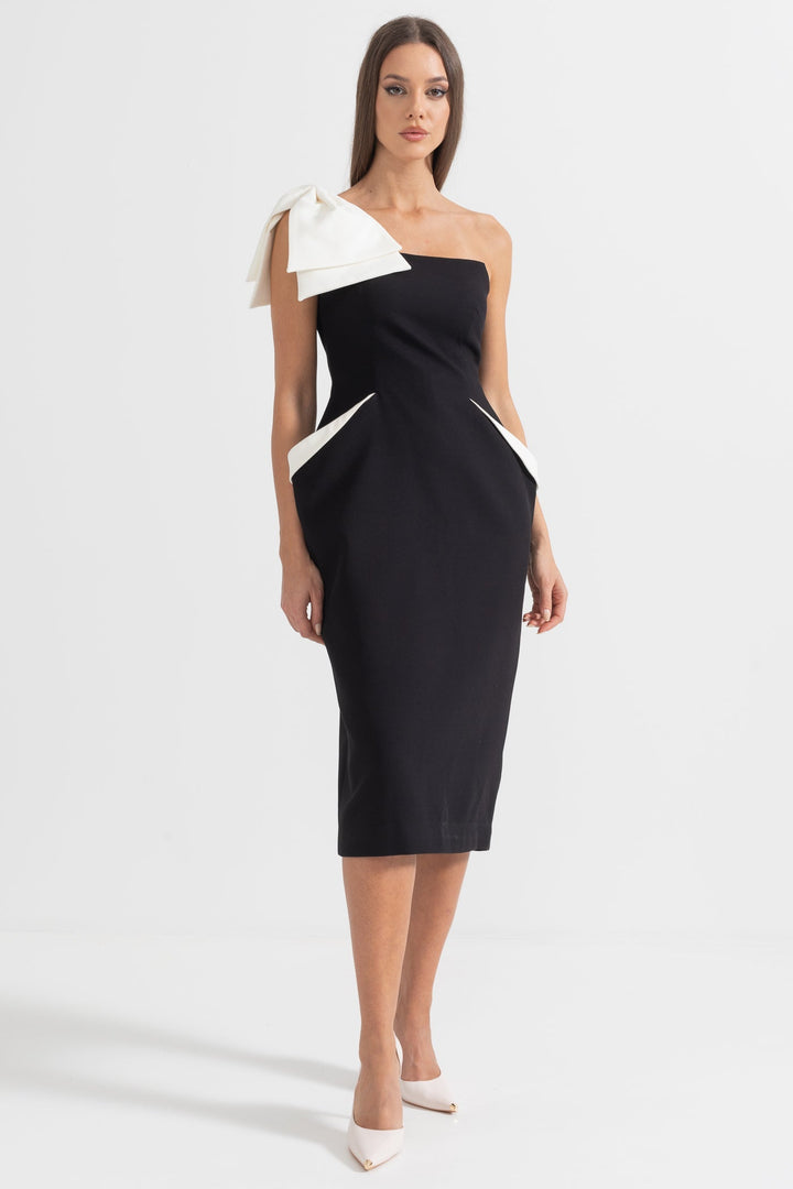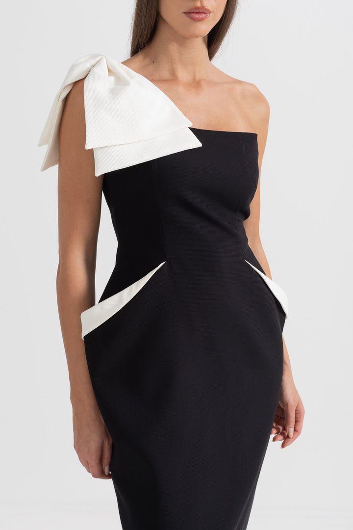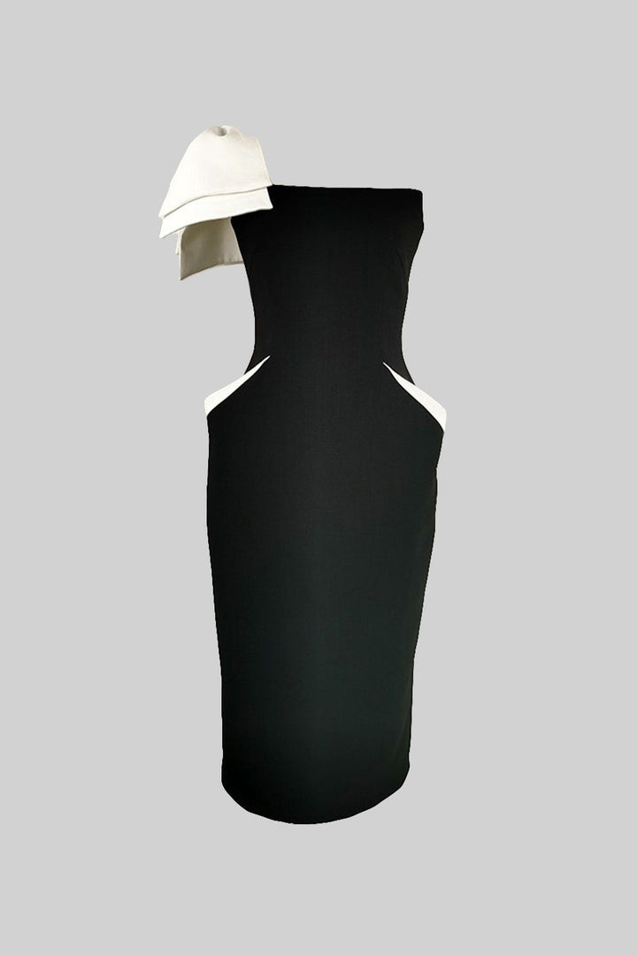 Siyah Tek Omuzlu Vücuda Oturan Elbise – Beyaz Detaylı