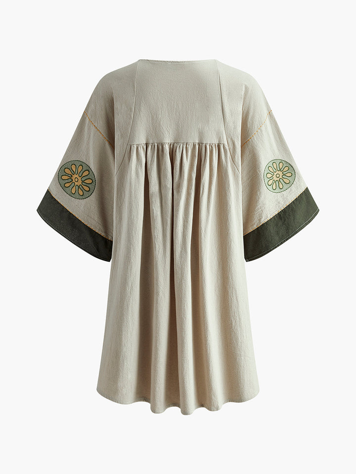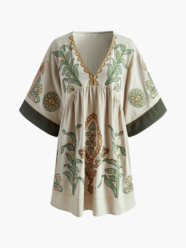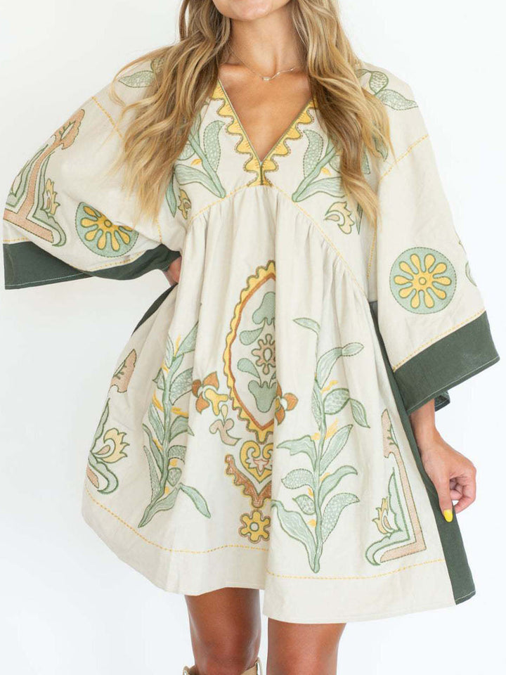 İşlemeli Yarım Kollu V Yaka Kısa Elbise – Günlük ve Şık