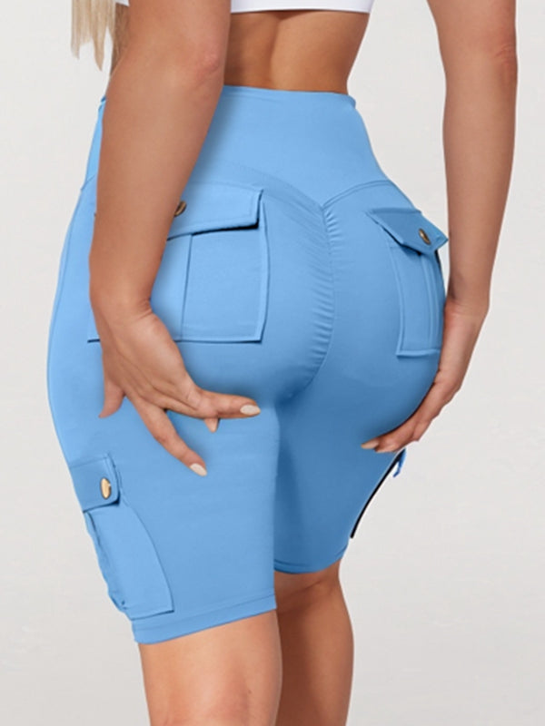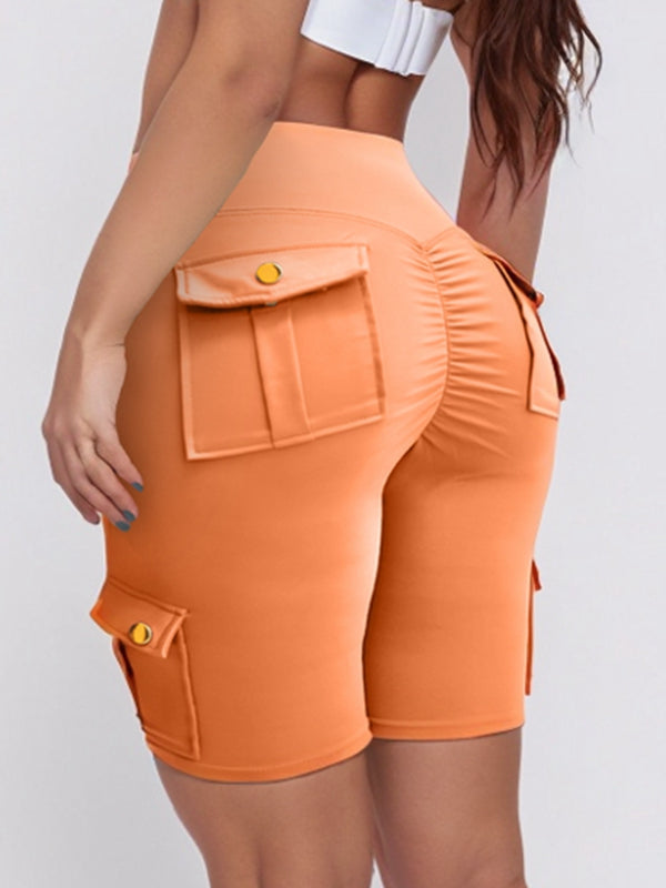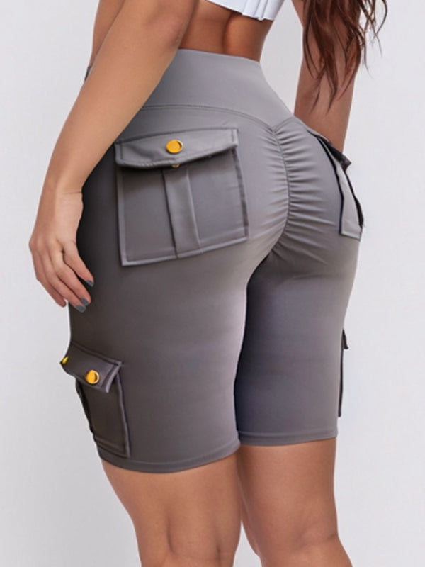 Cepli Buruşuk Kalça Yüksek Bel Kargo Tarzı Spandeks Spor Salonu Şortu
