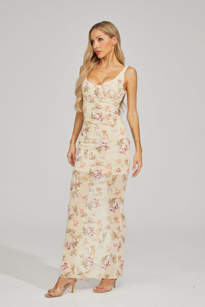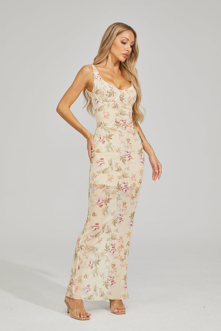 Zamansız zarafet ve romantik bir hava sunan bu çiçek işlemeli maxi elbise, pastel pembe, mor ve yeşil tonlarının ince işçiliğiyle öne çıkar. Yumuşak kare yaka ve kabarık kollar tasarıma vintage bir çekicilik katarken, vücuda oturan modern kesimi silueti zarifçe vurgular. Bahçe partileri veya şık akşam davetleri için ideal bir tercih olan bu elbise, feminen sofistike stilinizi tamamlayacak zamansız bir parça olarak gardırobunuzda yer alır.