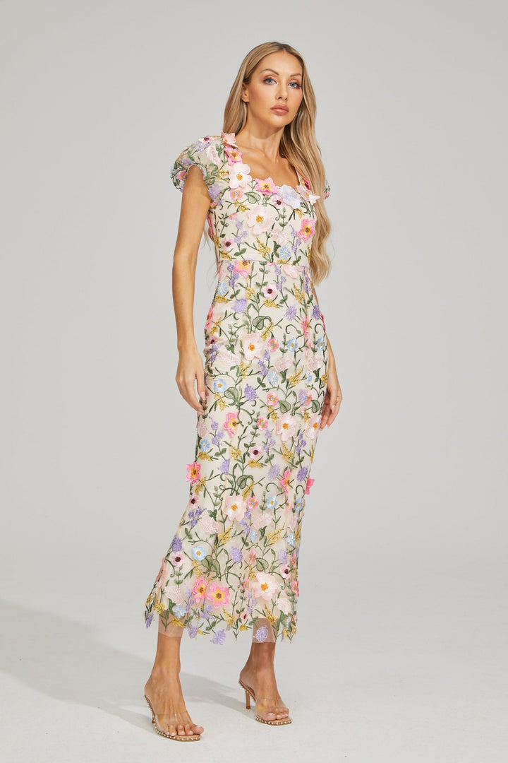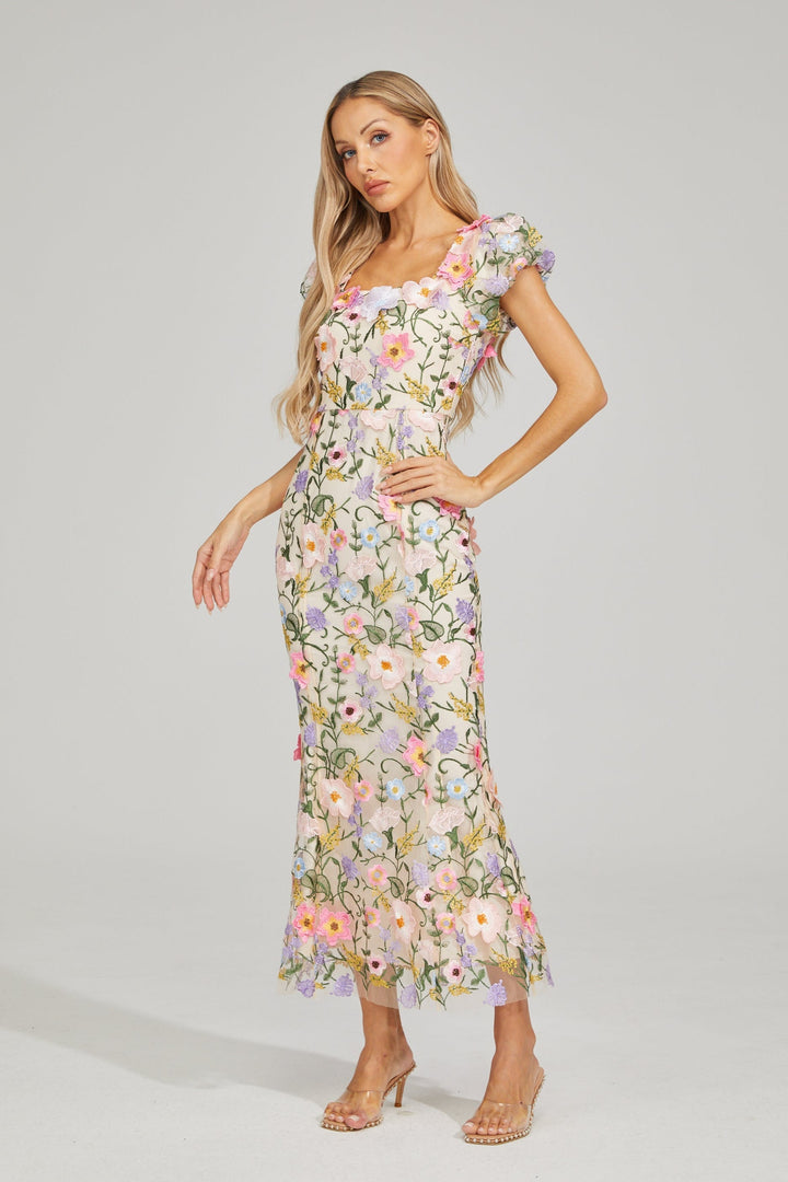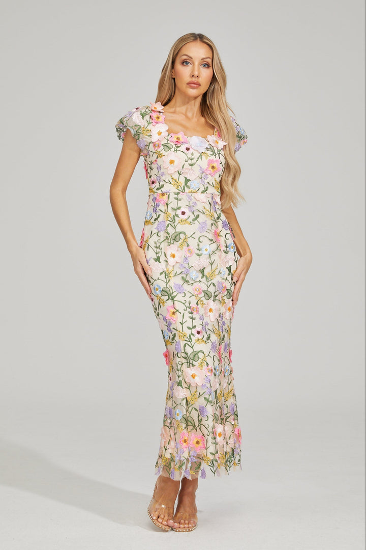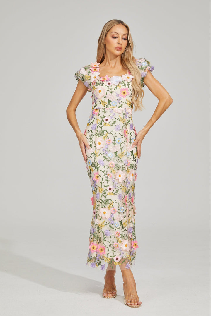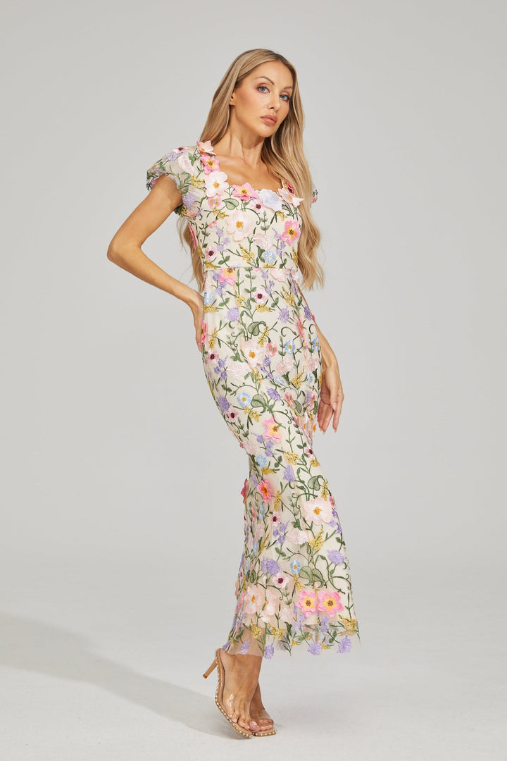 Zamansız zarafet ve romantik bir duruş sunan bu çiçek işlemeli maxi elbise, pastel pembe, mor ve yeşil tonlarının ince işçiliğiyle öne çıkar. Kare yaka ve kabarık kollar vintage bir çekicilik katarken, vücuda oturan modern kesimi silueti zarifçe vurgular. Bahçe partileri veya şık akşam davetleri için ideal bir tercih olan bu elbise, feminen sofistike stilinizi tamamlayacak zamansız bir parçadır.