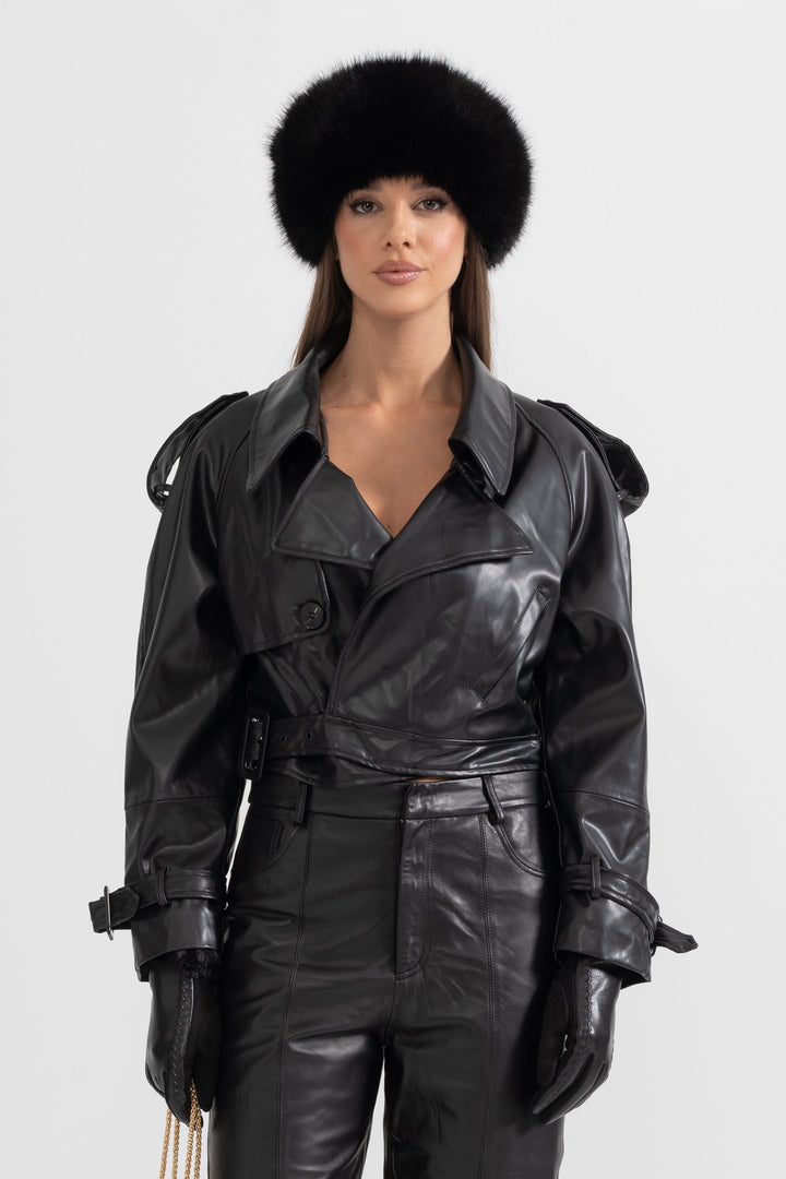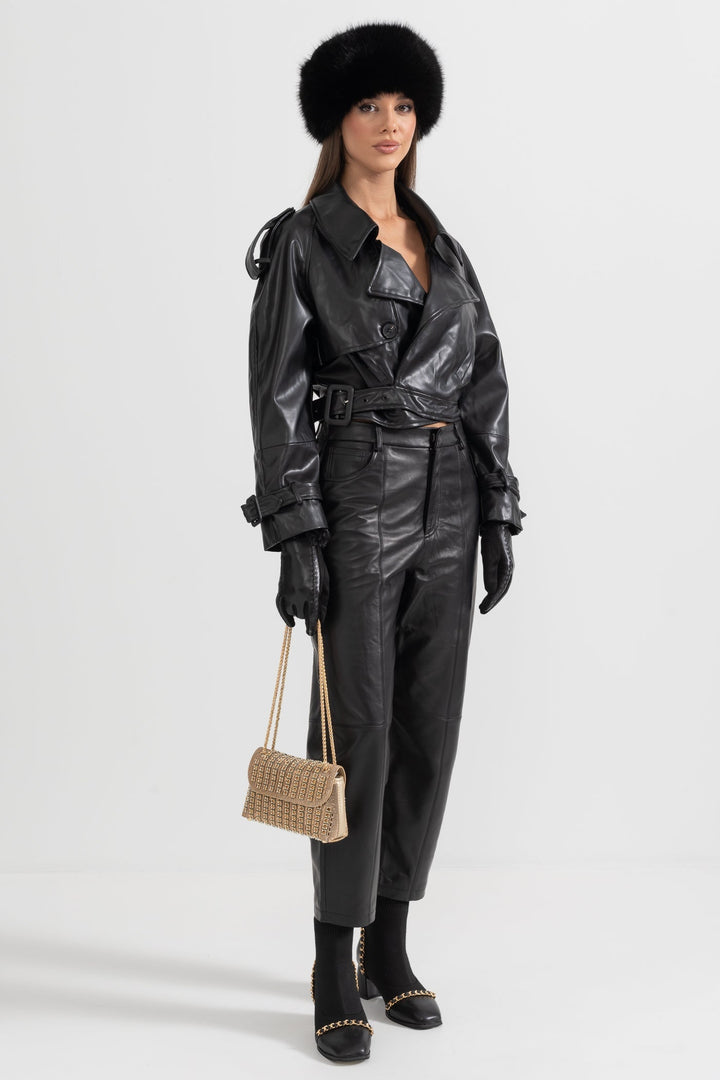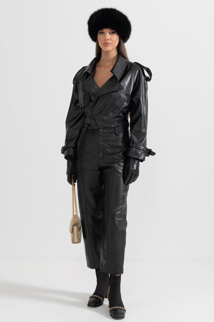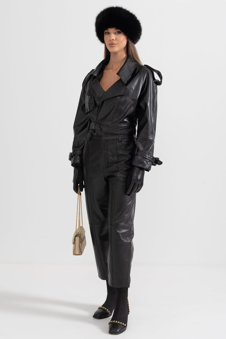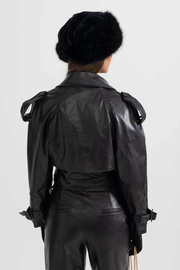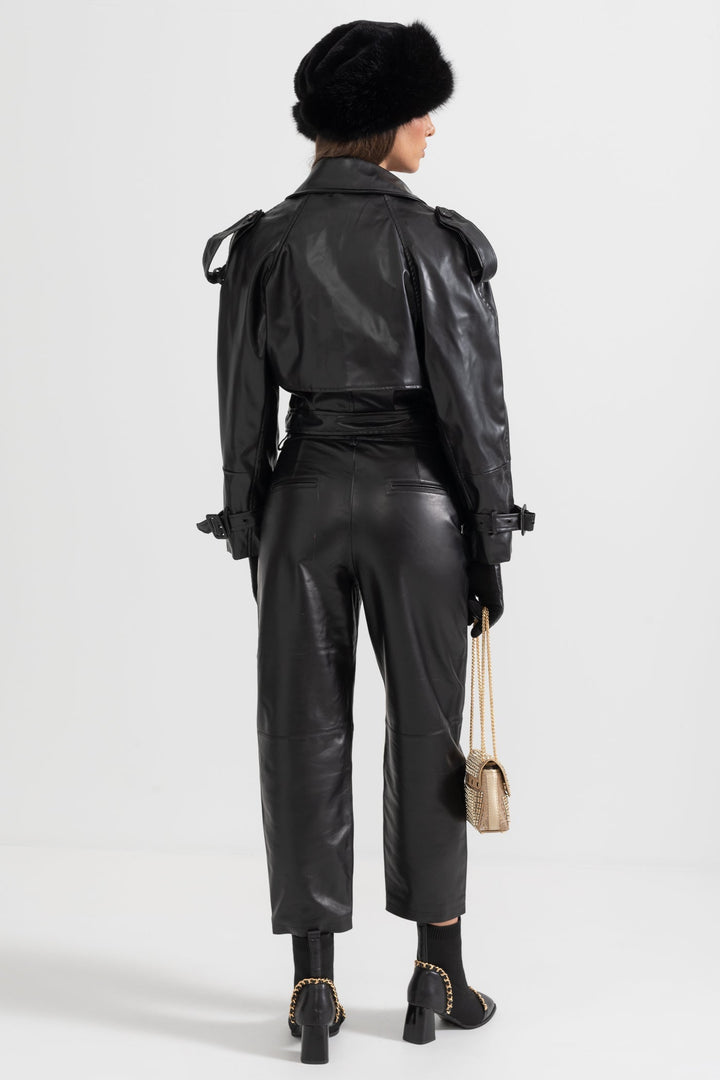 Klasik ve modern çizgiyi bir araya getiren bu siyah vegan deri ceket, güçlü ve sofistike tarzıyla öne çıkıyor. Dokulu yüzeyi, çift düğmeli ön kapaması ve geniş yakalarıyla zamansız bir şıklık sunarken; omuzlardaki düğmeli apoletler ve ayarlanabilir detaylar cekete karakteristik bir hava katıyor. Hem günlük kombinlerde hem de özel davetlerde rahatlıkla tercih edebilirsiniz.
