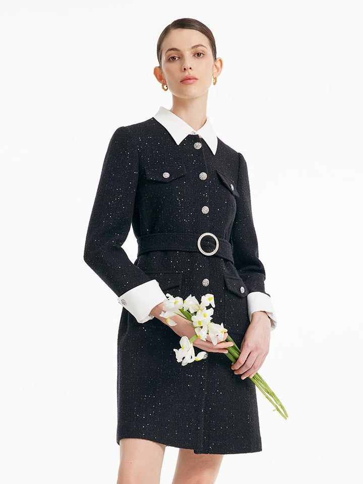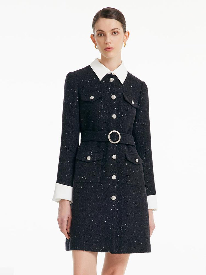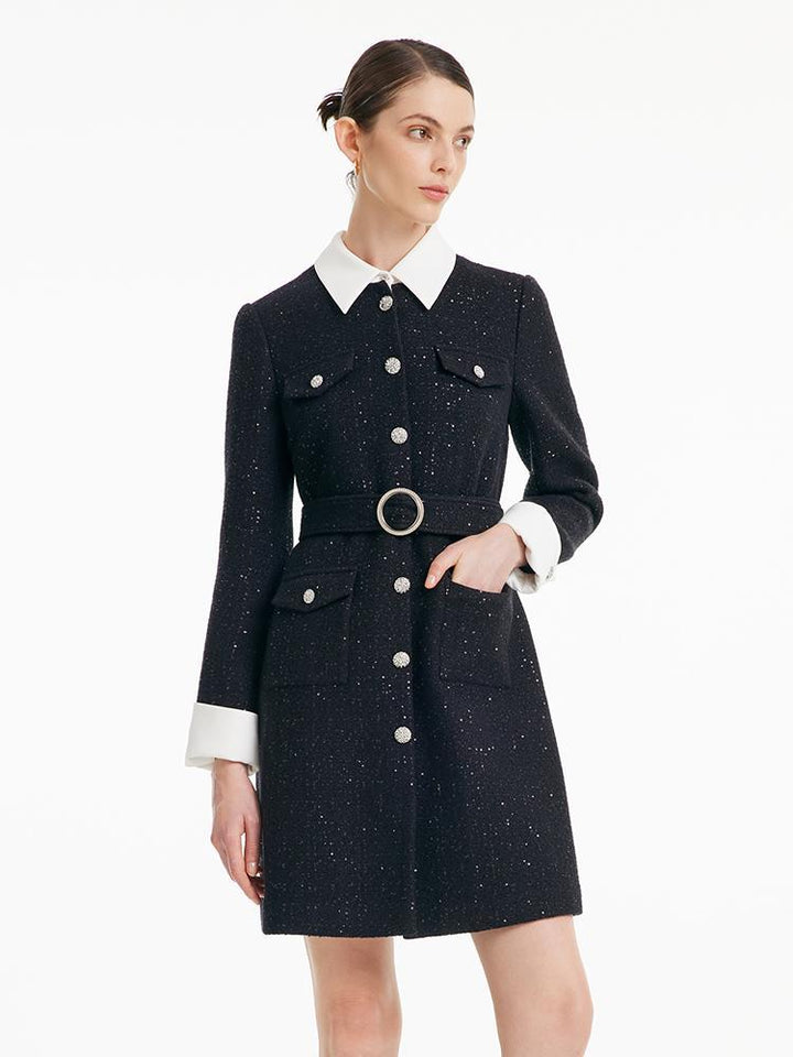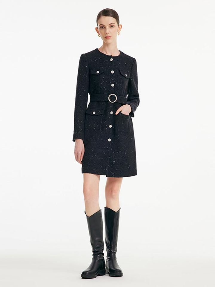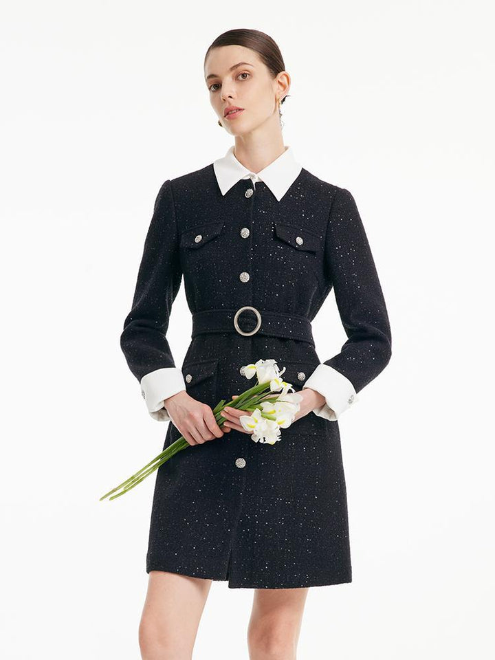 Bu elbise, yün karışımlı tweed kumaştan üretilmiştir. Kare omuz tasarımı ve bel vurgulu siluetiyle ince ve sofistike bir görünüm sunar. Belini vurgulamak için bir kemerle birlikte gelir. Elbise, çıkarılabilir gömlek yaka ve iki çıkarılabilir manşet ile çok yönlü stiller oluşturmanıza olanak tanır. Klasik vintage metal düğmeler, elbiseye zarif bir dokunuş katar. Oldukça çok yönlü olup, farklı etkinlikler için çeşitli aksesuarlarla kombinlenebilir.