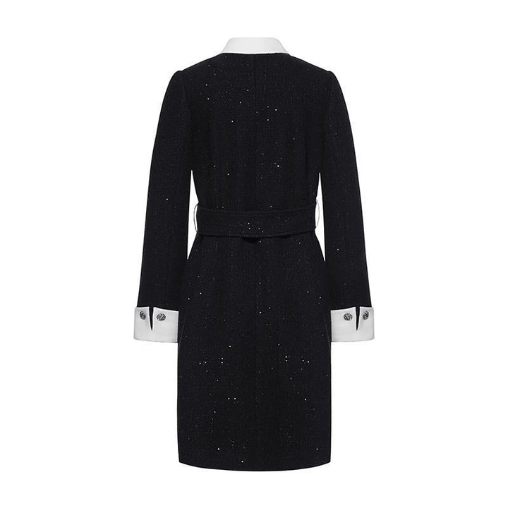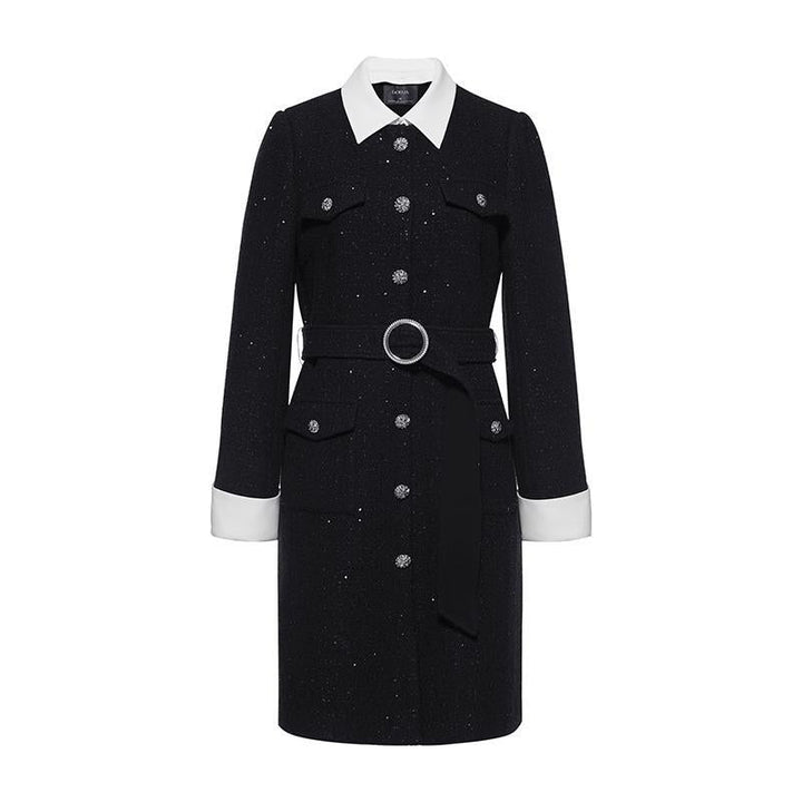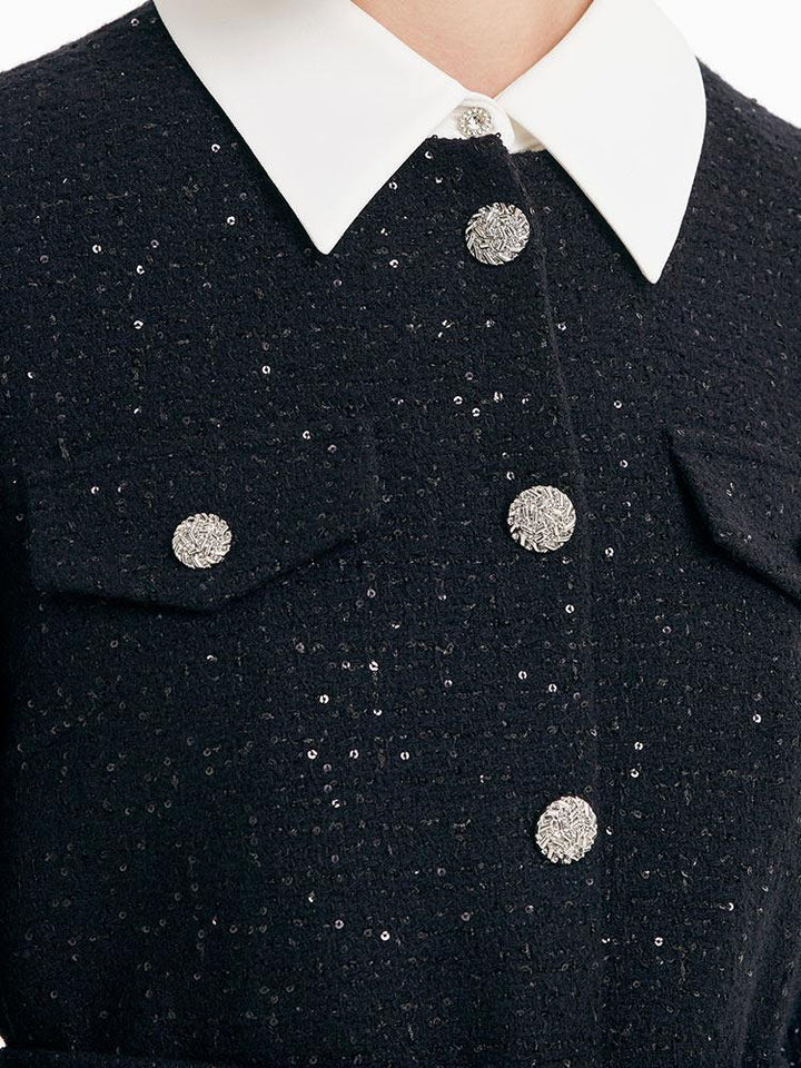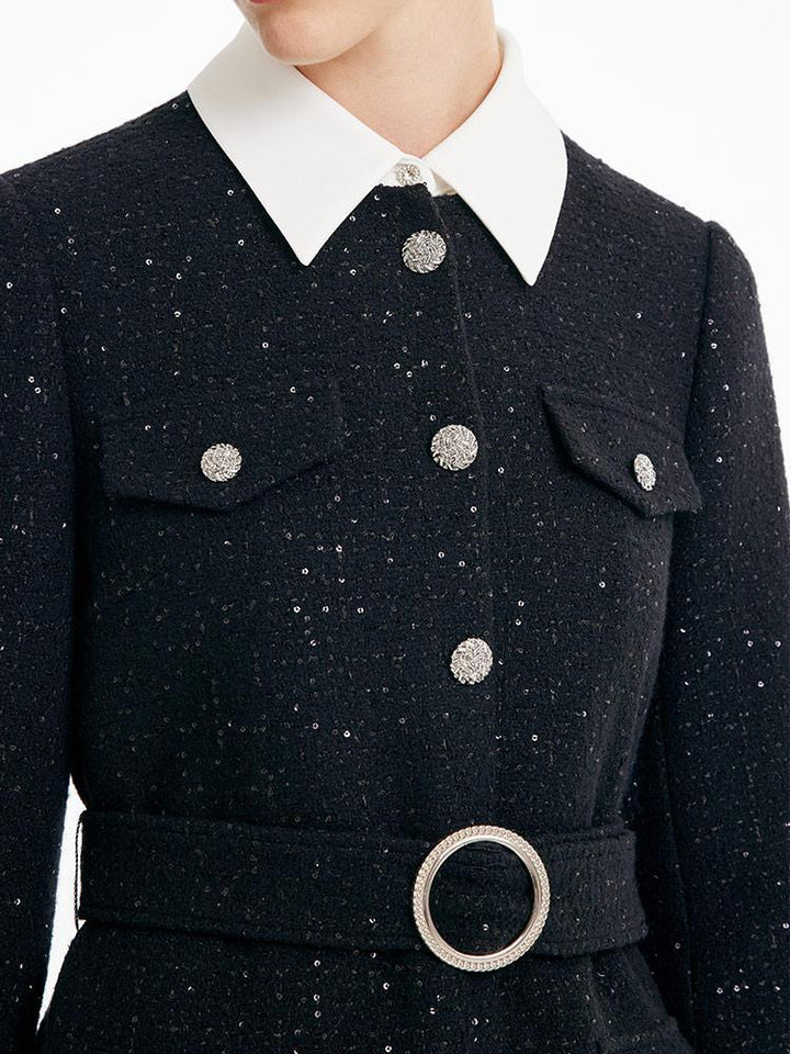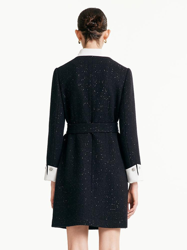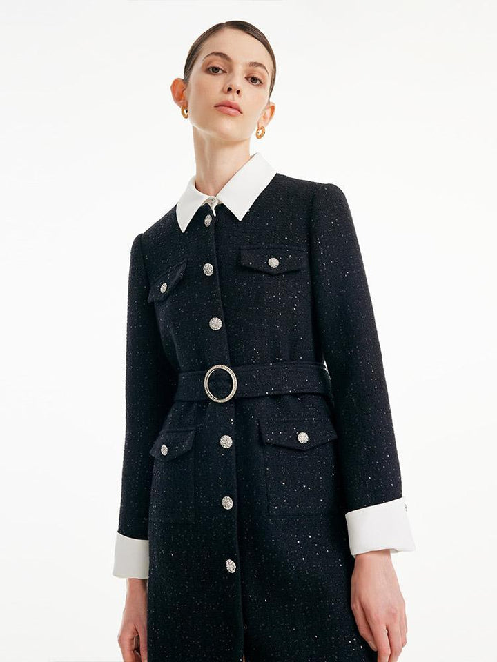 Bu elbise, yün karışımlı tweed kumaştan üretilmiştir. Kare omuz tasarımı ve bel vurgulu siluetiyle ince ve sofistike bir görünüm sunar. Belini vurgulamak için bir kemerle birlikte gelir. Elbise, çıkarılabilir gömlek yaka ve iki çıkarılabilir manşet ile çok yönlü stiller oluşturmanıza olanak tanır. Klasik vintage metal düğmeler, elbiseye zarif bir dokunuş katar. Oldukça çok yönlü olup, farklı etkinlikler için çeşitli aksesuarlarla kombinlenebilir.