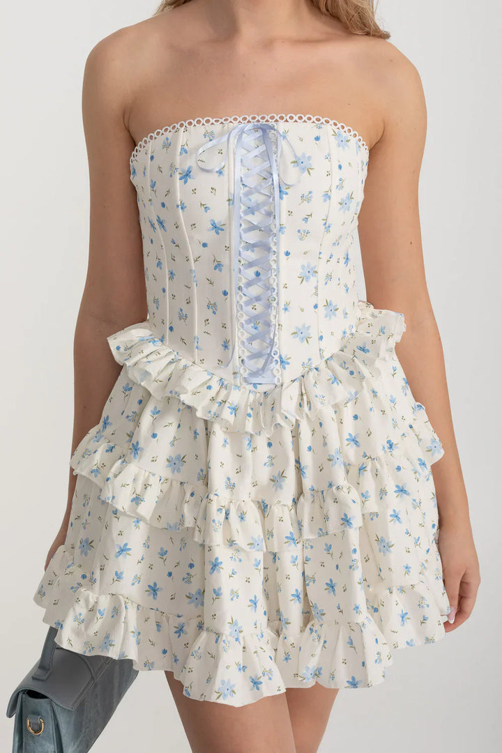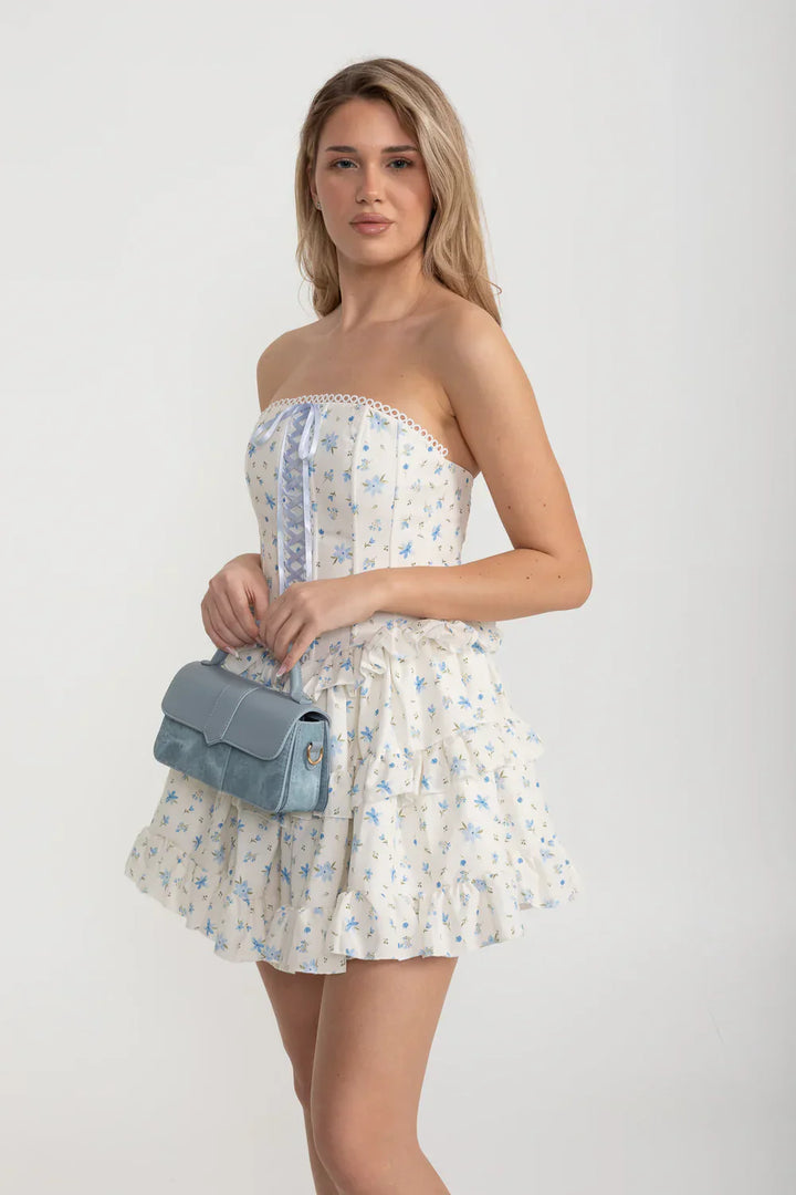 Kurdele Bağcık Detaylı ve Çok Katlı Fırfırlı Etekli Beyaz/Mavi Korse Mini Elbise