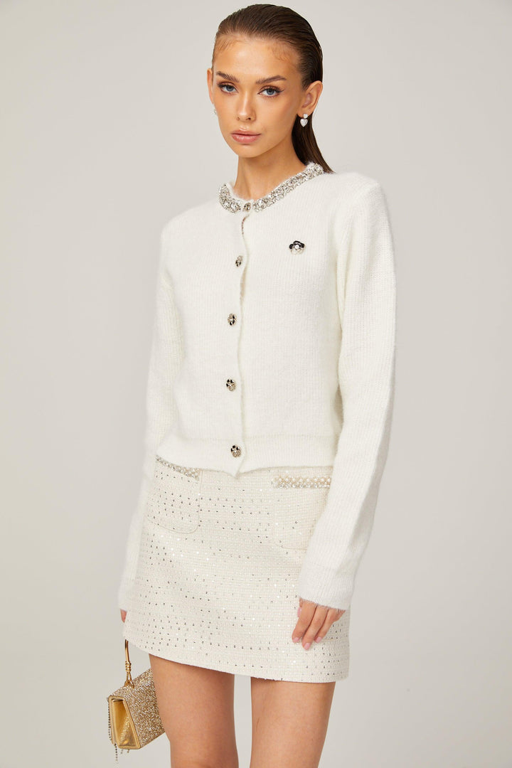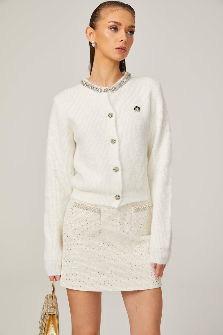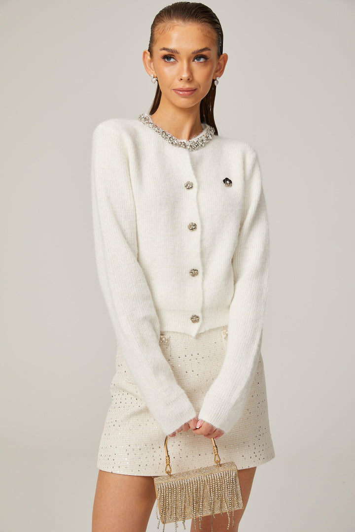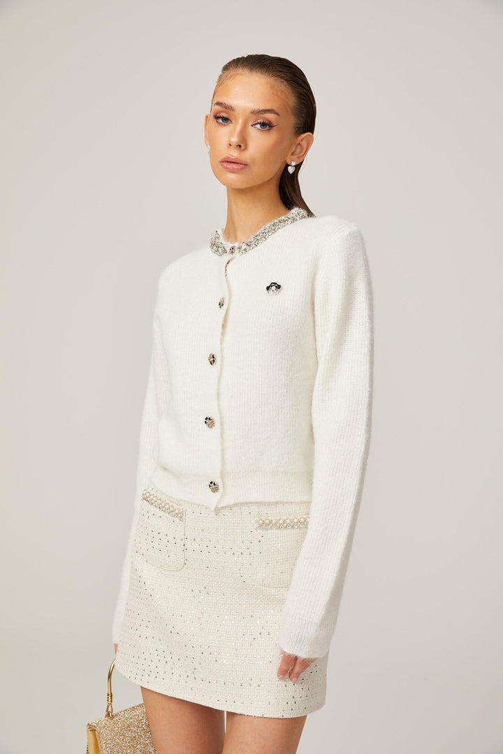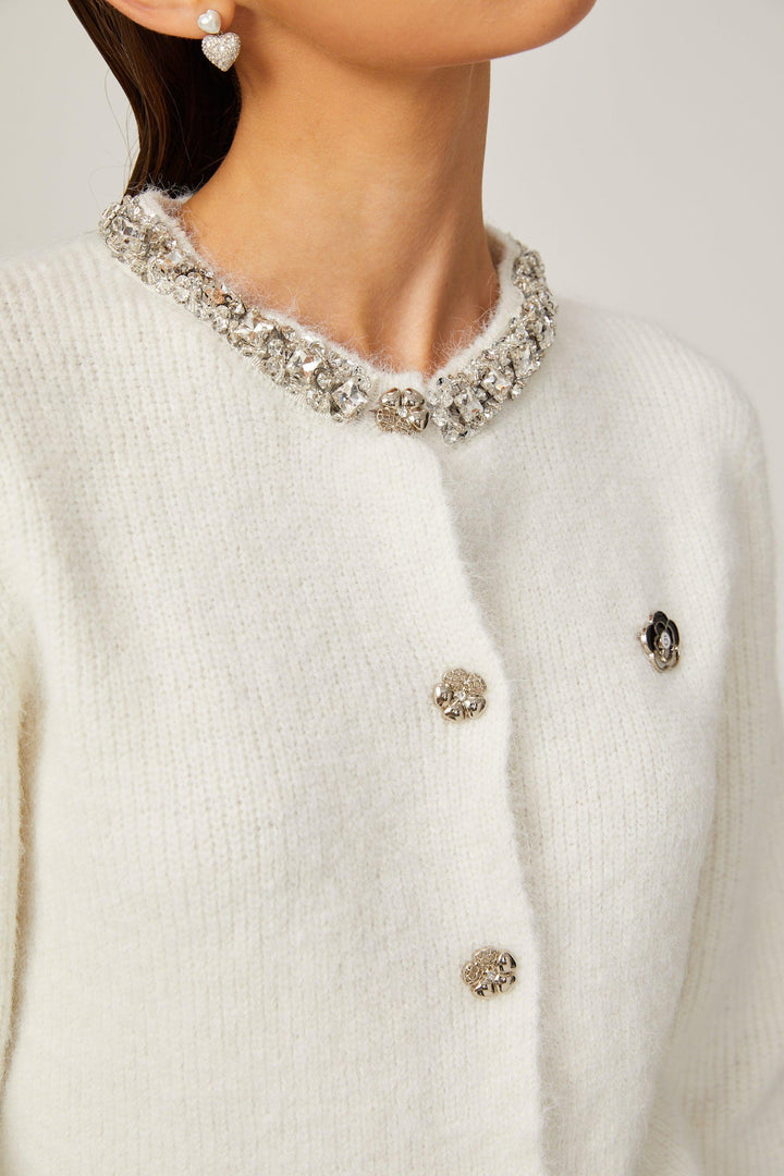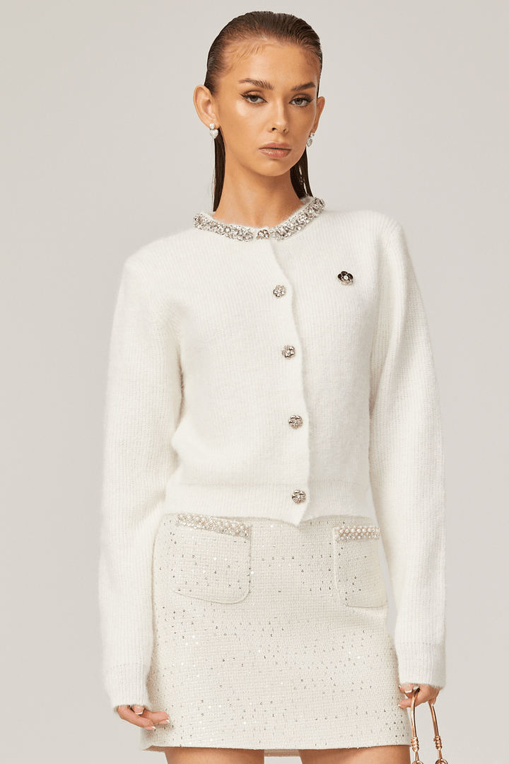 "Crystal Charm" hırka, zarif taş işlemeleri ve yumuşak dokusuyla sofistike bir stil sunar. İnci detaylı düğmeler ve zarif tasarımı, hem günlük kombinlerinize hem de özel davetlere şıklık katar. Minimalist bir zarafet arayanlar için ideal bir seçim.