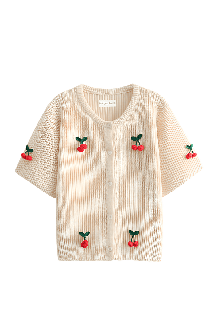 Büyüleyici kiraz işlemeleriyle süslenmiş ve şık kısa kesim tarzda tasarlanmış V yaka hırkamızla gardırobunuzu yükseltin. Bu düz renkli, orta kalınlıkta örgü kazak, rahat ve bol bir kesime ve tek sıra düğmelere sahiptir ve konforu zarafetle birleştirir.