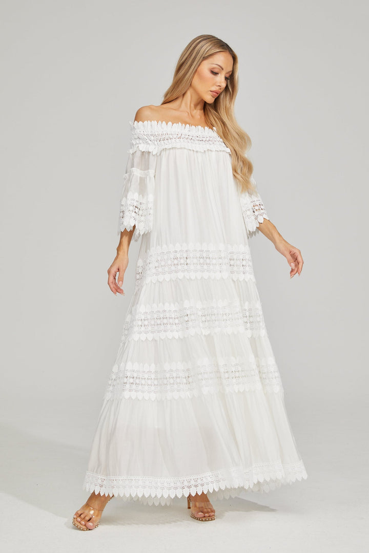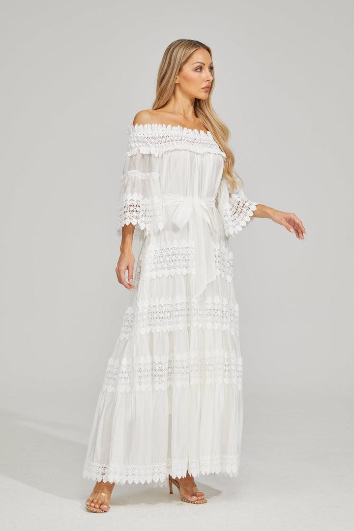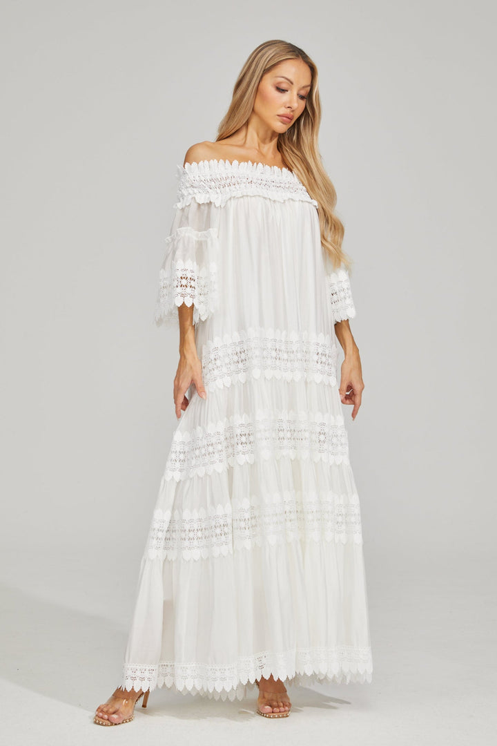 Zarif ve hafif bir siluet sunan bu omuz dekolteli maxi elbise, yumuşak pileli yakası ve katlı dantel panelleri ile öne çıkar. Etek uçlarındaki fırfır ve dantel detayları tasarıma romantik bir dokunuş katarken, ince bel bağı vücudu nazikçe kavrayarak feminen bir siluet oluşturur. Hafif ve hava alan kumaşı, plaj düğünleri, bahçe brunchları veya özel akşam etkinlikleri için ideal bir tercih sunar.