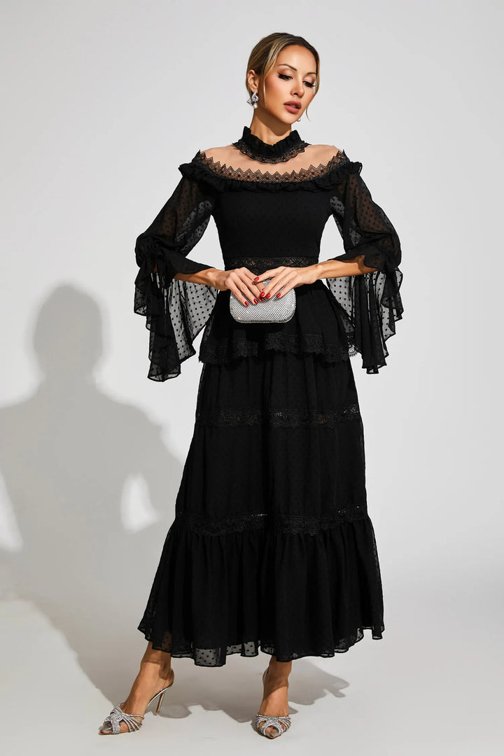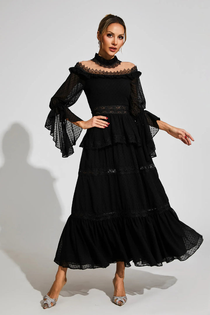 Dantel Uzun Kollu Maxi Elbise, zarafet ve sofistike bir şıklıkla tasarlanmıştır. Volanlı kolları, omuz açık yakası ve gotik esintili dantel dokusu ile zamansız bir çekicilik sunar. Hem özel davetlerde hem de günlük şıklıkta rahatlıkla tercih edebileceğiniz bu elbise, güzellik ve konforu kusursuz bir şekilde birleştirir. Stilinizde asil ve iddialı bir dokunuş için mükemmel bir seçimdir.
