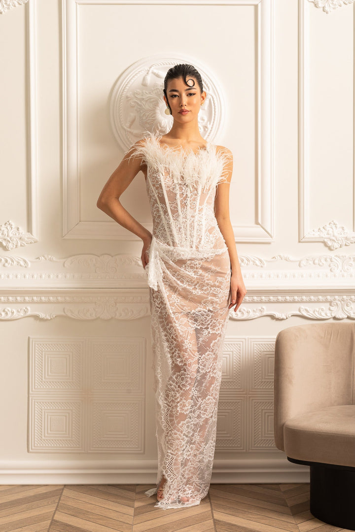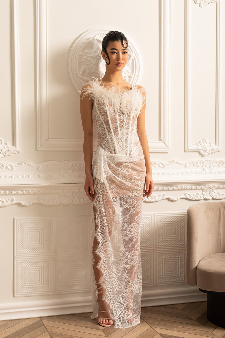 Tüy Süslemeli Yaka Detaylı Zarif Dantel Abiye Elbise – Beyaz