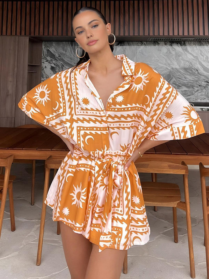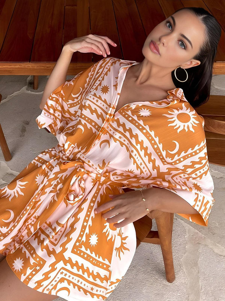 Canlı desenleri ve dökümlü kesimiyle dikkat çeken bu tulum, yaz günlerinde şıklık ve rahatlığı bir araya getiriyor. Hafif kumaşı ve belden bağlamalı tasarımıyla her ortamda zarif bir görünüm sunar.