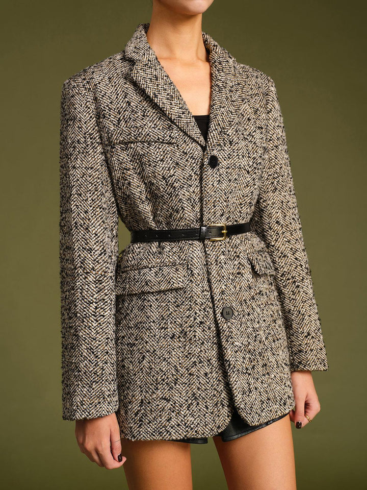 Ekru Balık Sırtı Desenli Kemerli Blazer Ceket