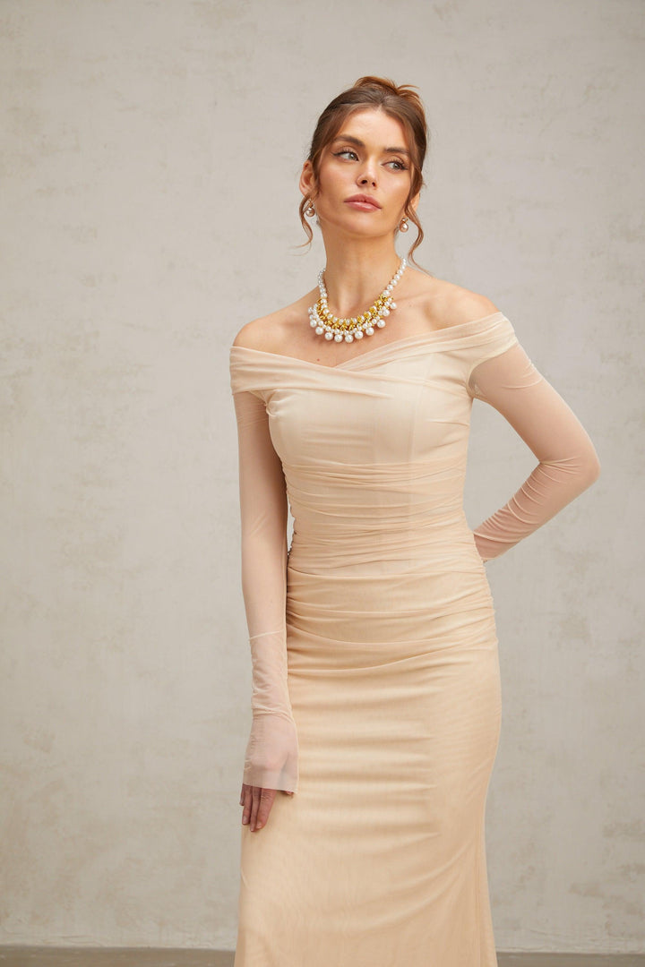 "Elegance Aura" uzun elbise, zarif tül detayları ve omuz dekoltesiyle büyüleyici bir görünüm sunuyor. Vücuda oturan kesimi ve soft nude tonu, sofistike bir şıklık arayanlar için mükemmel bir tercih. Özel davetler ve özel anlar için ideal bir seçenek!