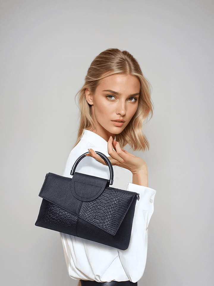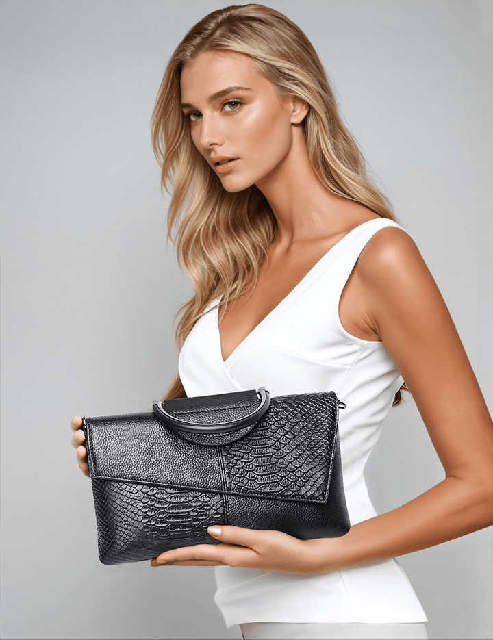 Elegance çanta, şıklığı ve zarafeti bir araya getiriyor. Yılan derisi dokusundaki tasarımı ve kaliteli siyah derisiyle hem günlük hem özel davetlerde stilinizi tamamlayacak. Minimalist sap detayları ve geniş iç hacmiyle hem şık hem kullanışlı!