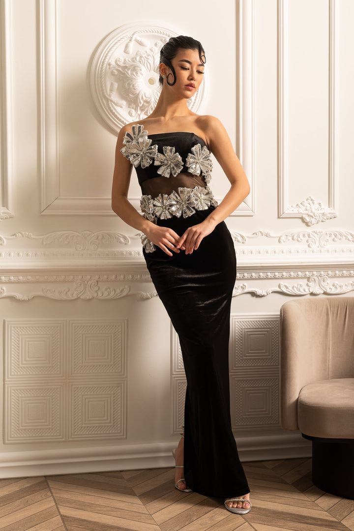 Siyah Gümüş Çiçek Detaylı ve Maxi Etekli Zarif Elbise