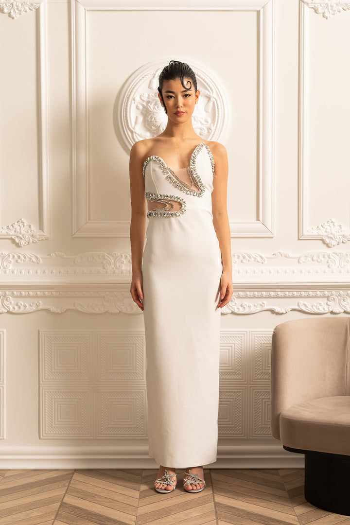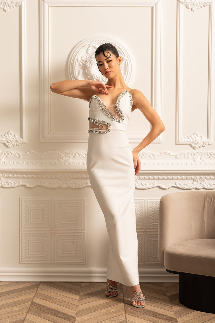 Ön Dekolteli ve Işıltılı Kristal Süslemeli Zarif Beyaz Vücuda Oturan Elbise