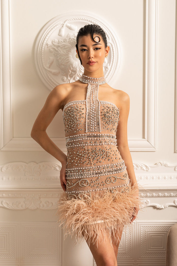 Boncuk ve Kristal Süslemeli Zarif Boyundan Bağlamalı Elbise – Bej