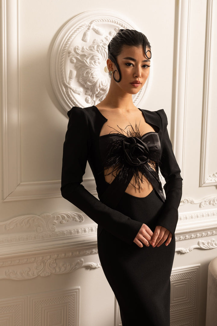 Yapılandırılmış Omuz ve Ön Dekolteli Zarif Uzun Kollu Elbise – Siyah