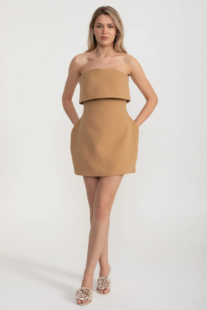 Kloş Etek Hatlı Haki Zarif Straplez Mini Elbise