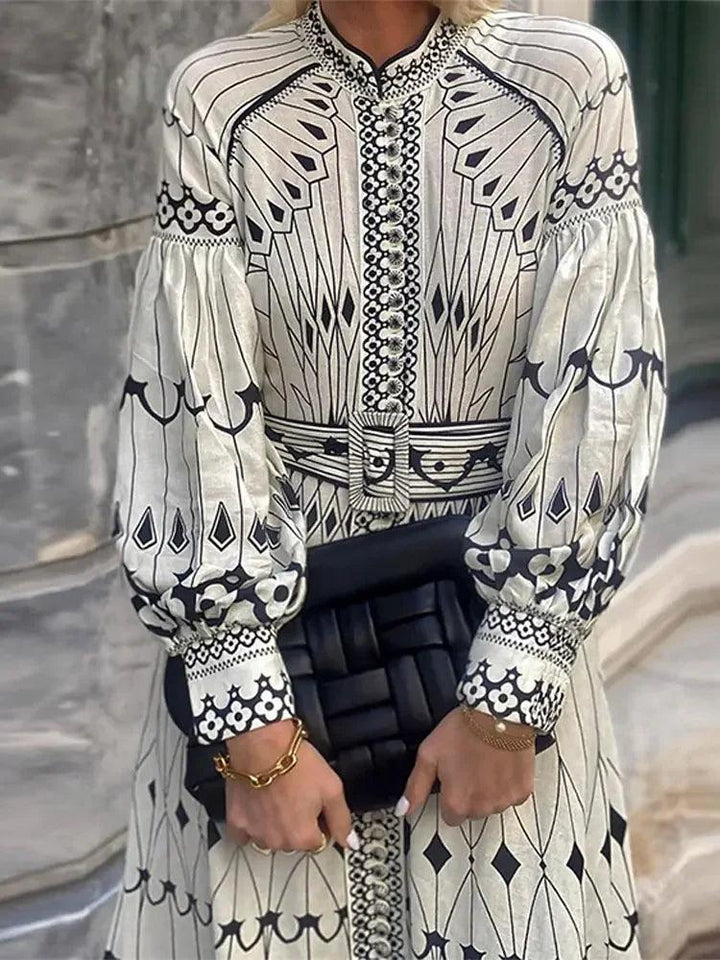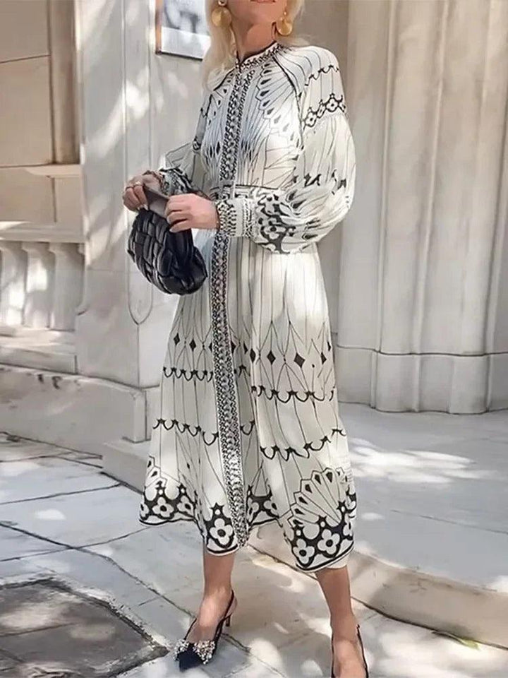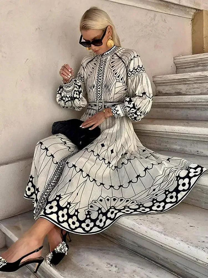 Elena elbise, şık siyah-beyaz desenleri ve zarif detaylarıyla dikkat çekiyor. Uzun kollu ve kemer detaylı tasarımı, hem klasik hem de modern bir stil sunar. Özel davetler ve günlük kombinler için mükemmel bir tercih. Şıklığınızı bir adım öne taşıyın!