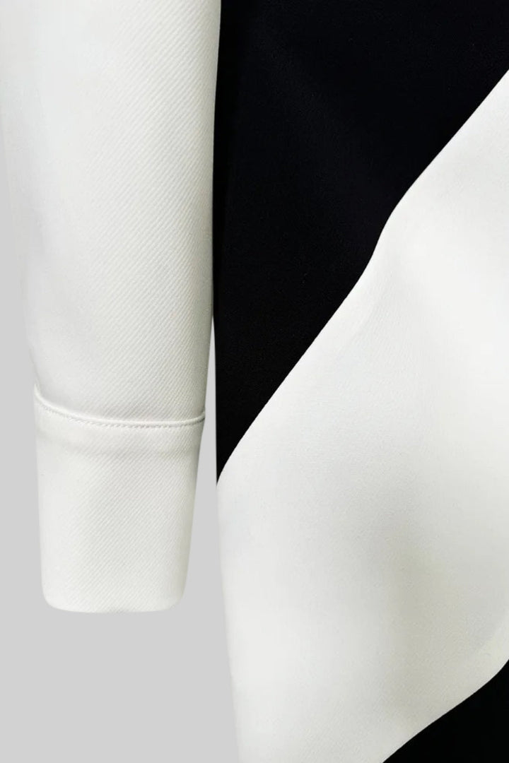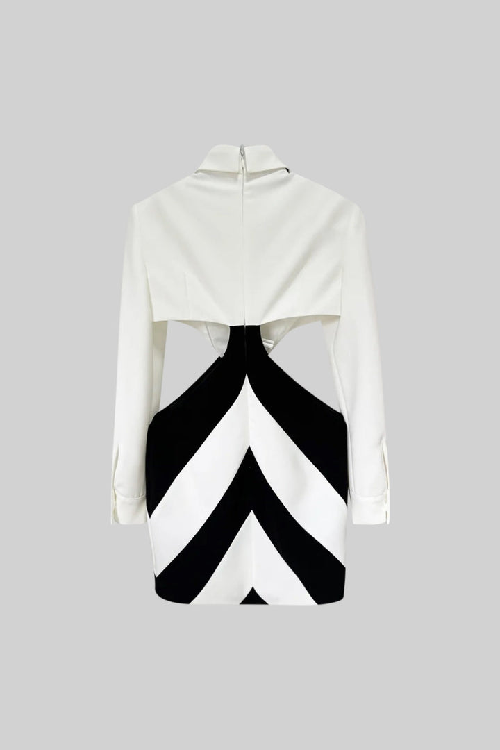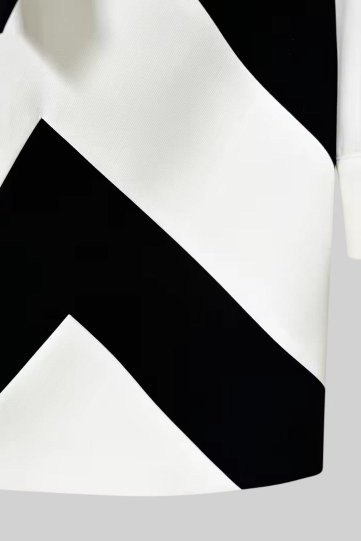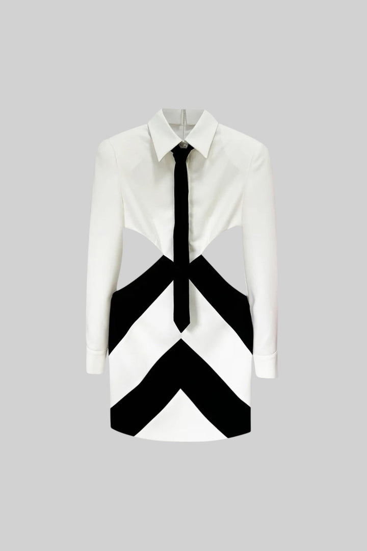 Şıklığı ve modern tasarımı bir araya getiren Beyaz Modern Elbise, sofistike bir duruş sunuyor. Üst kısmı gömlek tasarımına sahip olan bu elbise, uzun kollu yakalı gömlek bodisi ve yüksek belli etek bölümüyle dinamik bir kontrast oluşturuyor. Cesur siyah-beyaz şevron desenli eteği ve bel kısmındaki stratejik kesik detaylarıyla dikkat çekiyor. Şıklığı tamamlayan siyah kravat detayı ise elbiseye güçlü ve modern bir hava katıyor.