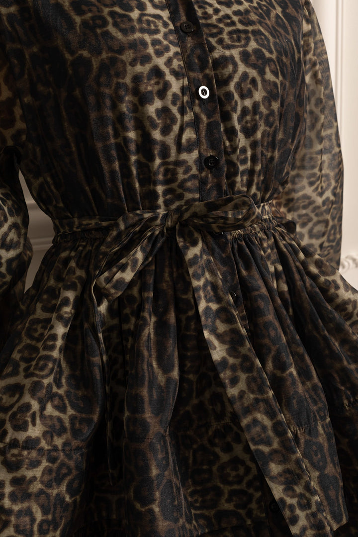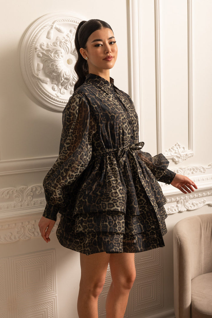 Cesur ve şık bir stil sunan bu siyah leopar desenli elbise, kısa silüeti ve hacimli kat kat eteği ile öne çıkıyor. Uzun kollu tasarımı ve uyumlu bel kemeriyle zarif bir görünüm sağlar. Hem günlük kullanımda hem de özel etkinliklerde şıklığınızı ön plana çıkarın!