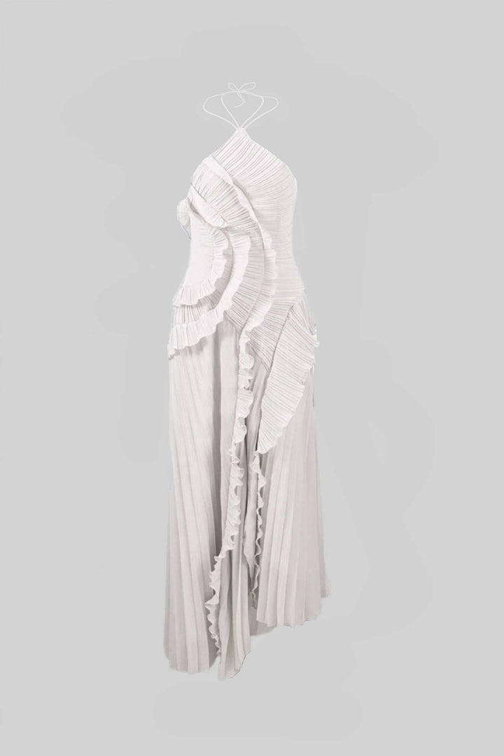 Fırfır Detaylı Pileli Halter Midi Elbise