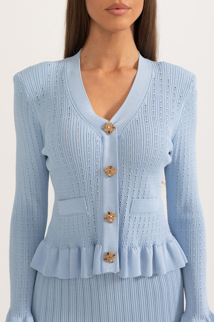 Bebek Mavisi Fırfırlı Ceket & Kloş Etek Örme Takım