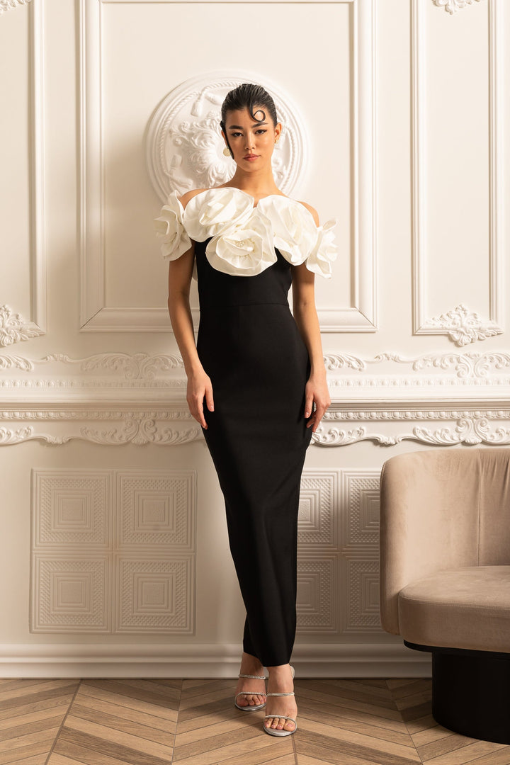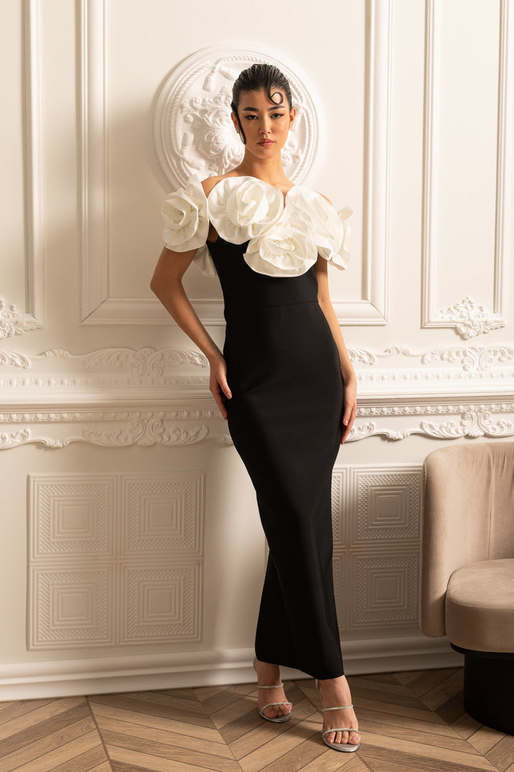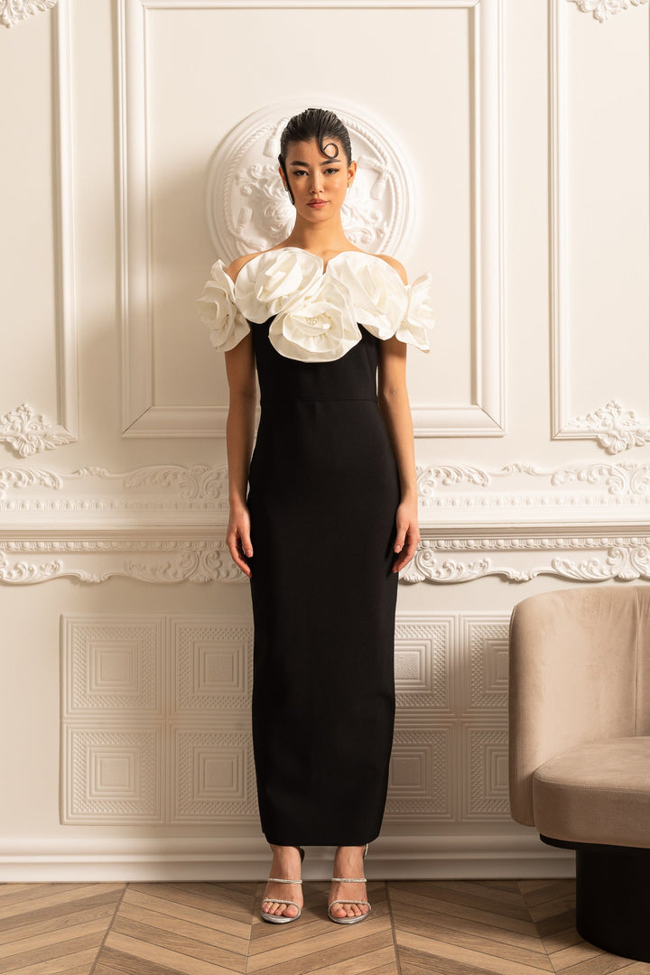 Büyük Beyaz Çiçek Süslemeli Siyah Gömme Elbise