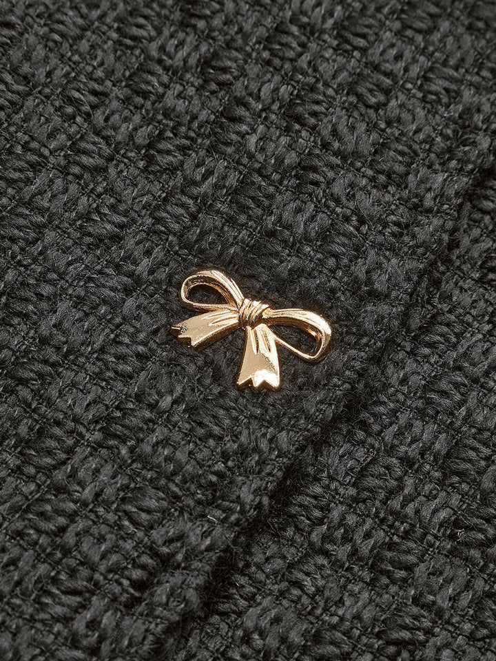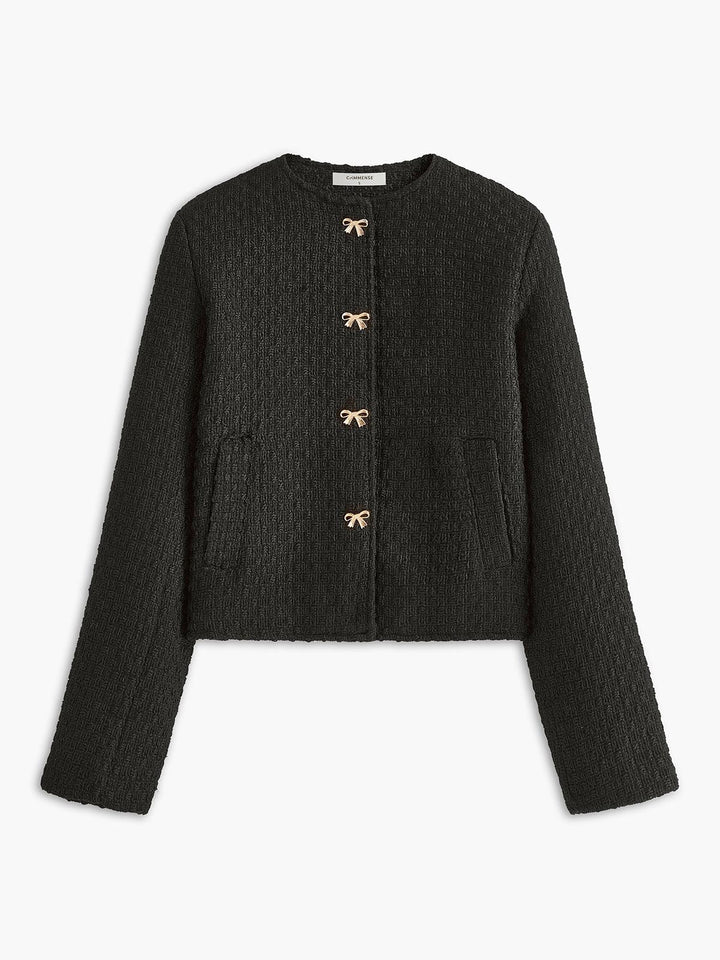 Şıklığı ve zarafeti bir araya getiren bu siyah kısa tweed ceket, altın fiyonk detaylarıyla dikkat çekiyor. Hem günlük hem de özel kombinlerinizde zarif bir dokunuş katacak eşsiz bir parça!