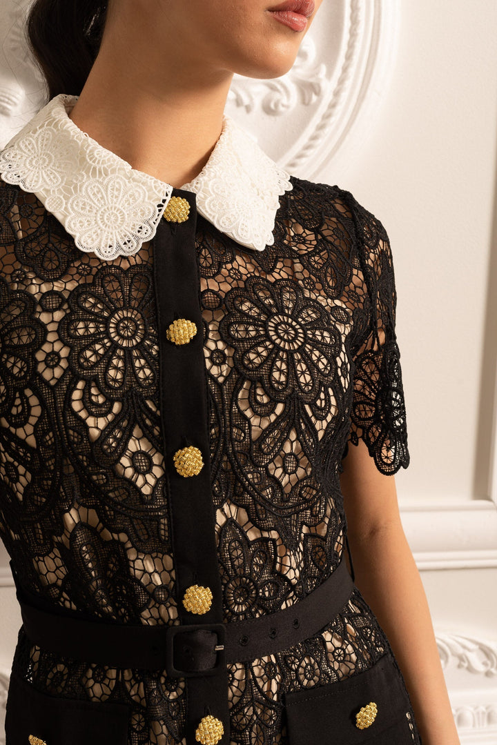 Karmaşık Dantel Desenli Kısa Kollu ve Kontrast Yakalı Çiçek Desenli Dantel Elbise - Siyah