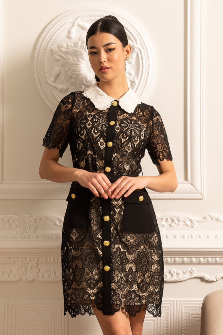 Kısa Kollu ve Kontrast Yakalı Çiçek Desenli Dantel Elbise - Siyah