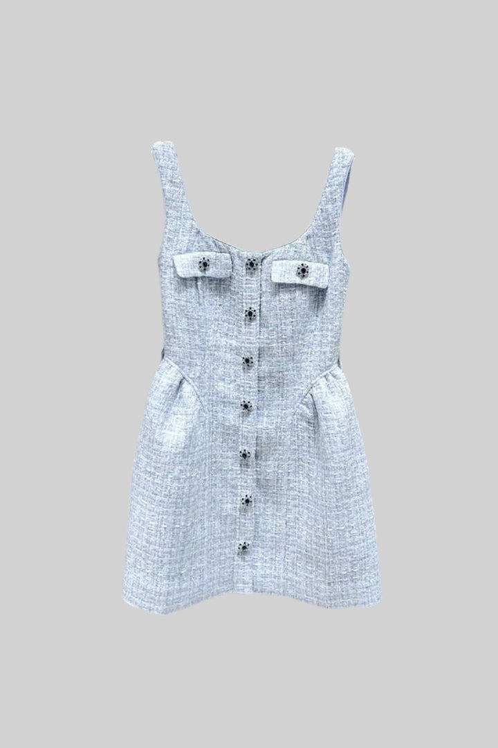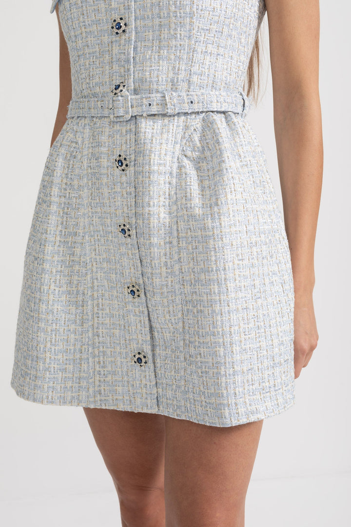 Açık Mavi Dokulu Mini Elbise, Bedene Uygun Kesim ve Zıt Renkli Düğmeler ile