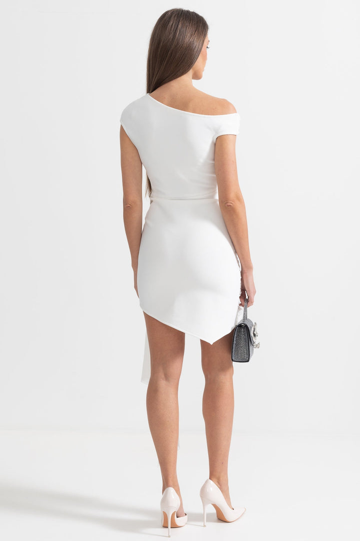Beyaz Tek Omuz Drapeli Elbise – Gümüş Çiçek Broş Detaylı