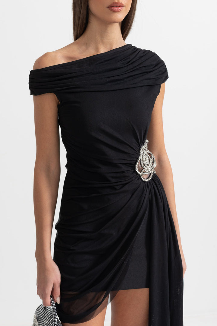 Gümüş Çiçekli Broşlu Tek Omuzlu Dökümlü Elbise