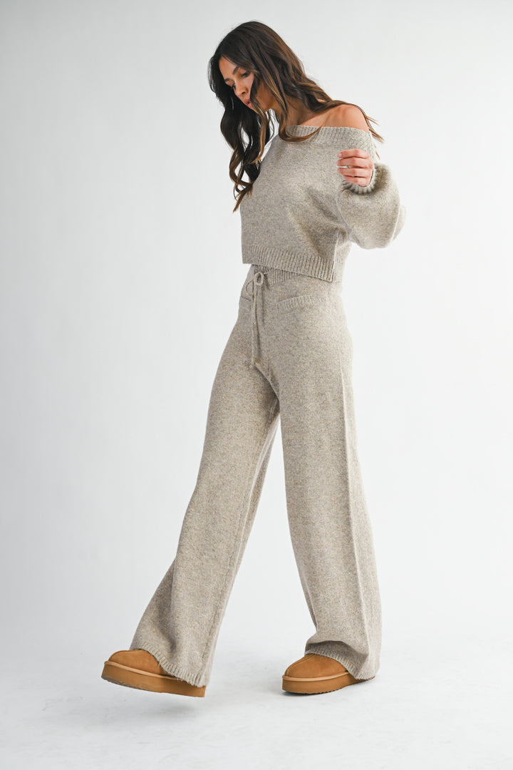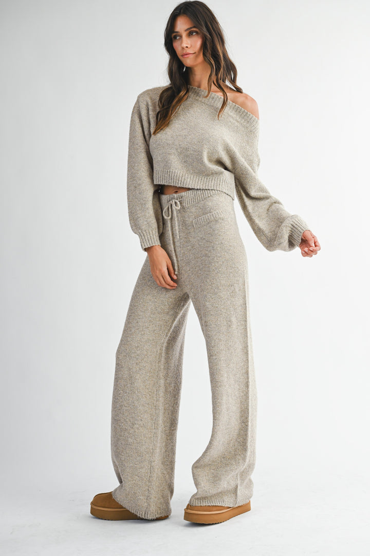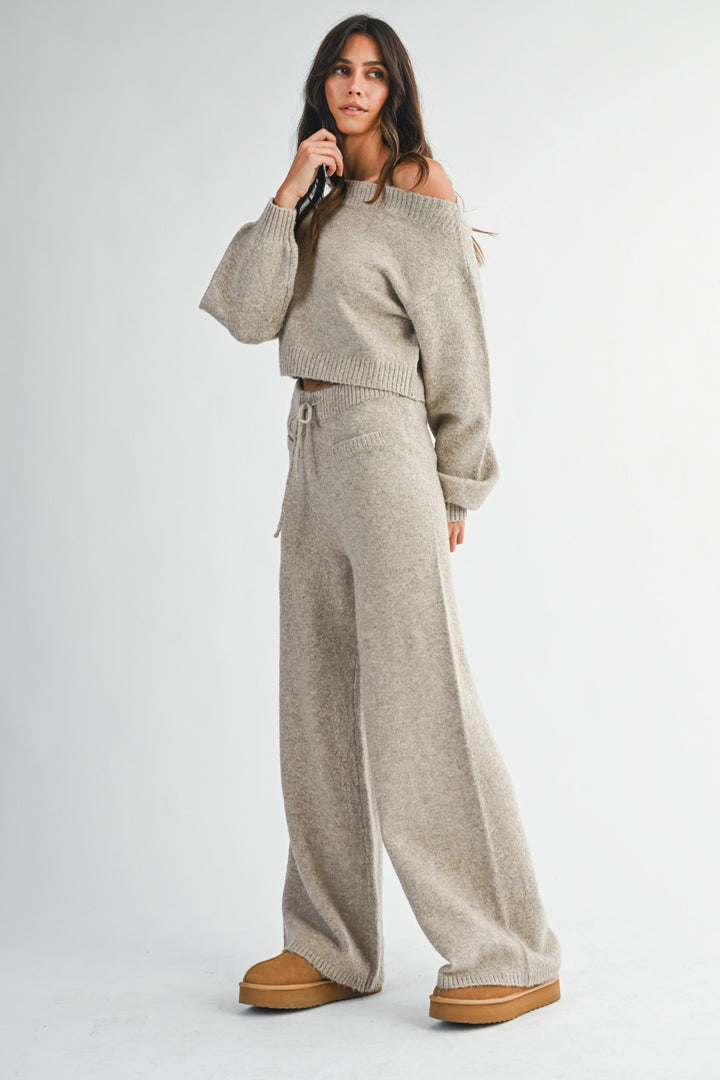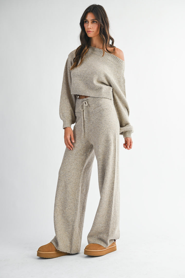 Beli lastikli, ip bağlamalı bol paça triko pantolon