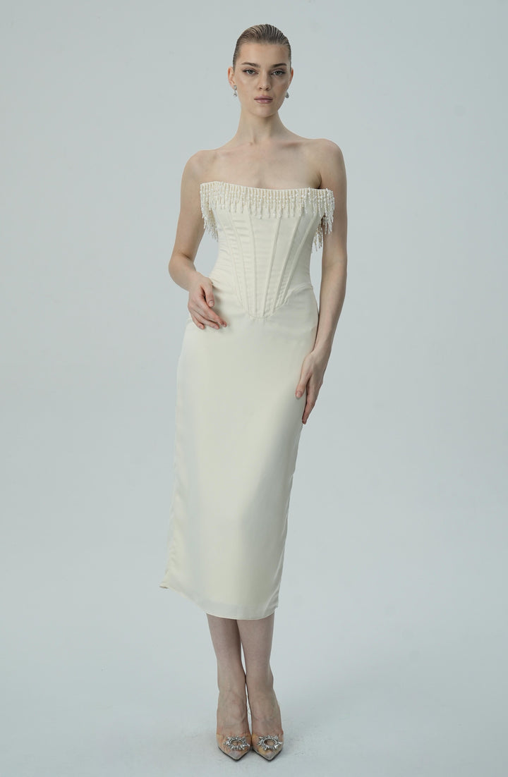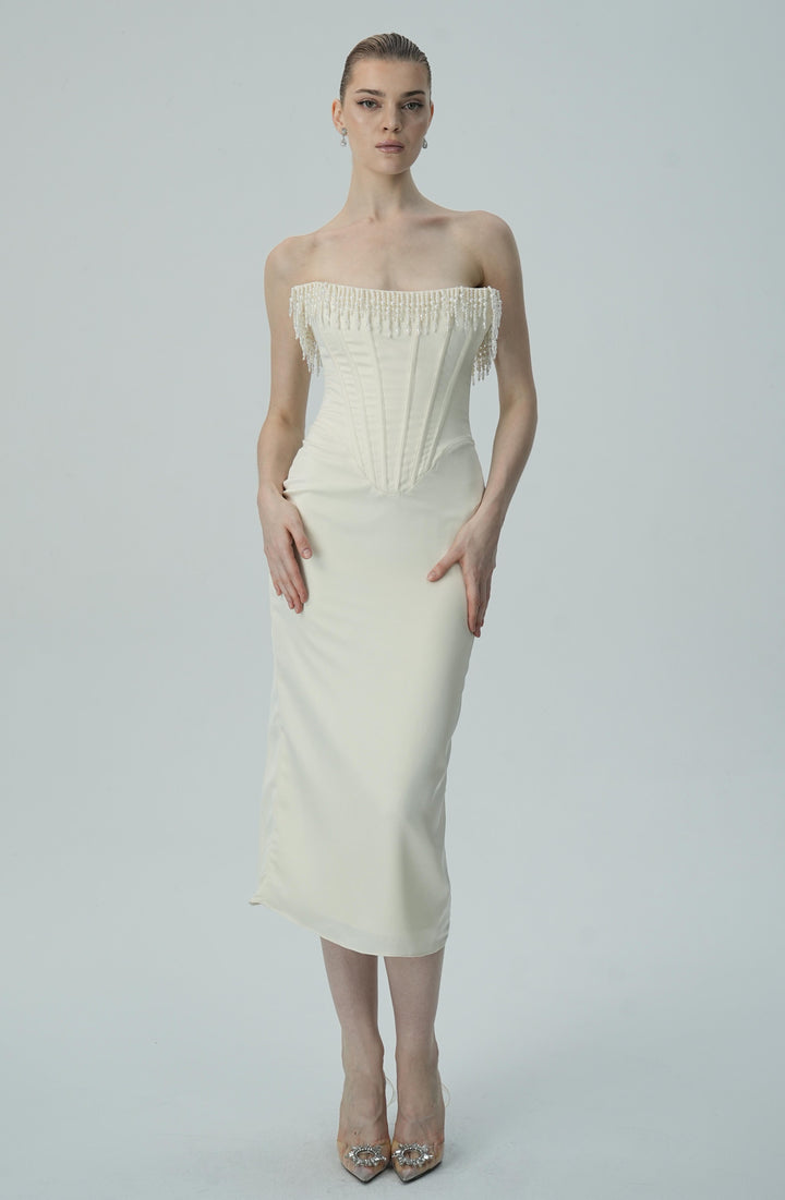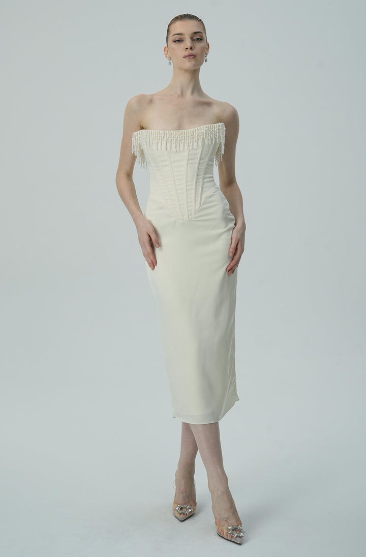 İnci Püsküllü Omuzsuz Korse Midi Elbise – Zamansız ve Sofistike