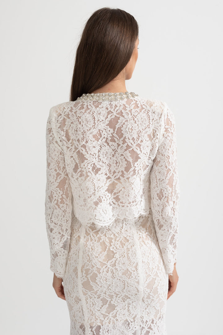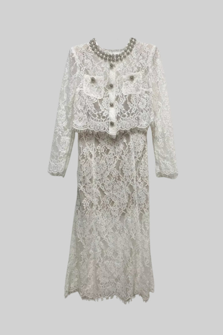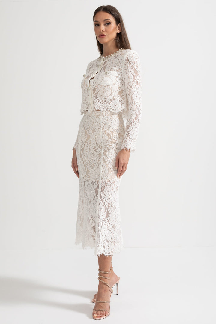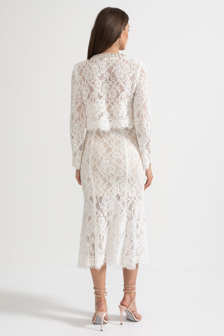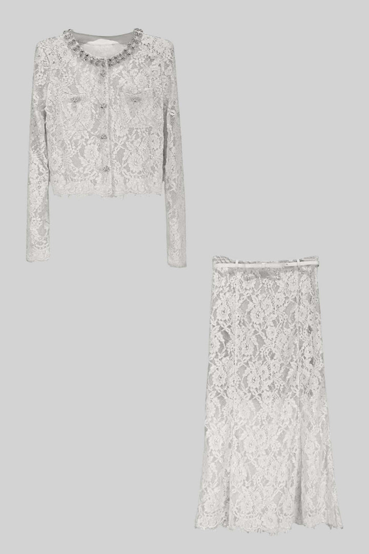 Beyaz Dantel Ko-Ord, Parıldayan Yaka Süslemeleri ve Midi Etek ile
